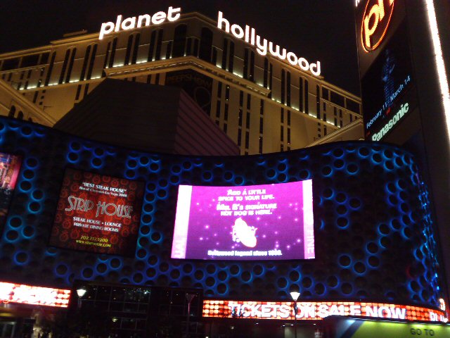 Es war wirklich gut wieder im Auto zu sitzen, den da konnte man die Heitzung an machen und sich ein wenig aufwären. Ja Ihr hab richtig gehört, wir haben mitten in der Wüste die Heitzung im Auto angemacht. Ok wir waren auch gute 12 oder mehr Stunden draußen im Regen und im Kalten unterwegs gewesen. Man rechnet ja auch nicht, daß es mitten in der Wüste regnen würde oder geschweige kalt sein könnte. Es war schon verrückt. So sind wir dann ab zum Las Vegas Strip zurück gefahren. Es war zwar schon verhältnismäßig spät da ja das Rennen auch gute 3 Stunden länger gedauert hatte, aber wir wollten noch ein wenig uns anschauen. Wir entschlossen uns kurzehand in das Planet Hollywoold Hotel zu fahren, da ich das schon immer mal sehen wollte als alter Sylvester Stallone Fan. Für alle dies nicht wissen sei gesagt, daß das Planet Hollywood Restaurant Sylvester Stallone und Arnold Schwarzennegger gehören. Ja richtig, Arnold der Terminator und der jetzige Gouvanur von Las Angeles.