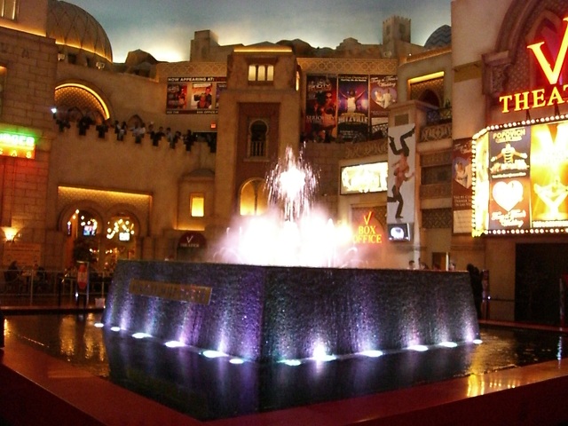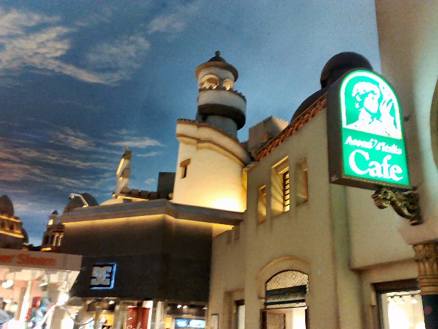 Wir sind durch die Gänge durch. Auf einmal dachte man ÄHHH was ist den jetzt los ? Sind wir schon wieder draußen. Über uns war auf einmal ein stahlend blauer Himmel. Wir waren aber nicht draußen sondern im Gebäude. Trotzdem hatte man das Gefühl draußen zu sein. Es war unbeschreiblich genial. Man konnte nach oben schauen, aber man konnte keine Decke erkennen. Es sah so unendlich aus, wie eben draußen wenn man hoch in den Himmel schaut. Auch Wolken waren dort oben. Die bewegeten sich und sie wurden auch alle 30Min. grau und es kam ein Regenschauer runter. Wohlgemerkt im Hotel das will ich noch einmal betonen. Einfach super geil gemacht. Auch gab es dort ein Glücksbrunnen. Dort konnte man ein paar Cents reinwerfen und sich was wünschen. Das hatte ich ja schon einmal im NASCAR-Café gesehen gehabt. Dort war es aber kein Brunnen sondern das Winston Cup Auto von Dale Earnhardt Sr. wo man die Cents reingeworfen hatte. Wir haben es hier sowie im NASCAR - Café auch gemacht.