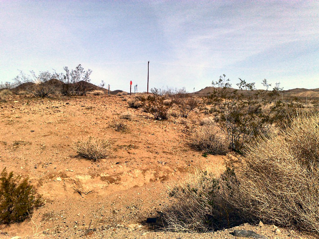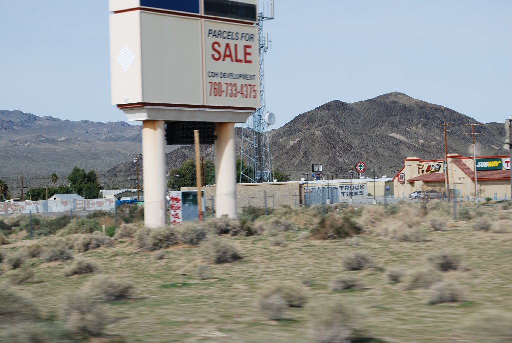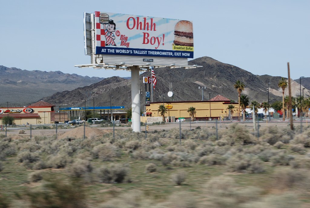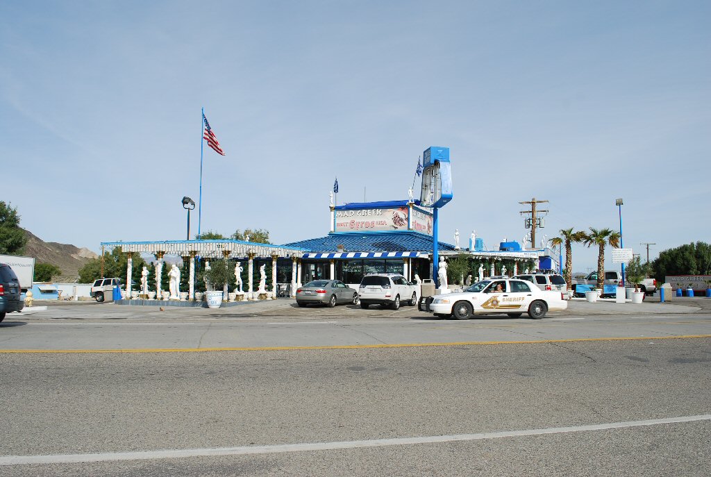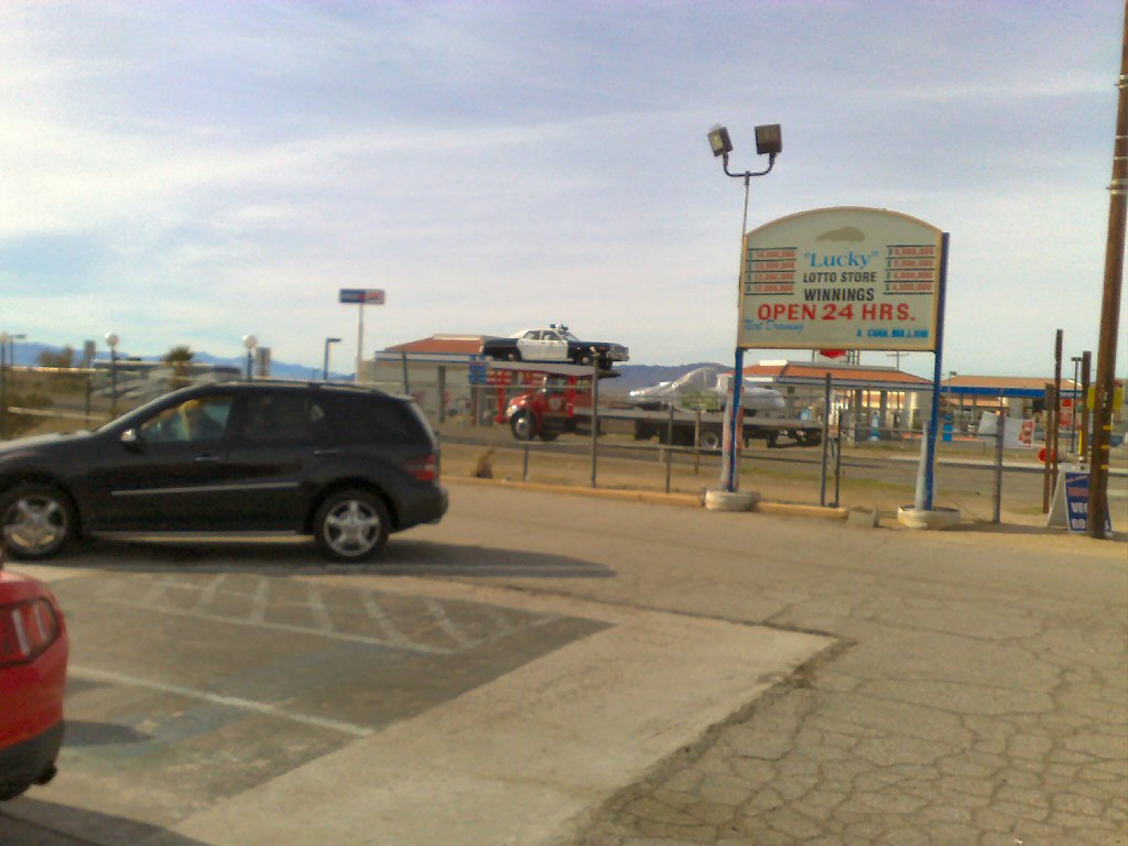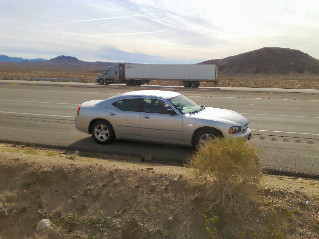 So ging es eine ganze weile weiter bis wir an einem typischen Schild vorbei gefahren sind wo die Nummer vom Freeway drauf stand. Das wollten wir fotogafieren und das war auch gleichzeit die gelegenheit nach mittlerweile zwei Stunden fahrt auch eine kleine Pause zu machen. So habe ich am Seitenstreifen angehalten und wir sind zum Schild gegangen und haben Fotos davon gemacht. Im hintergrund ist ein Policecar angehalten. Der ist dort stehen geblieben und hat bestimmt Geschwindigkeitsmessungen gemacht. Das war auch so typisch USA und man kannte das nur aus diversen Filmen, aber das gab es wirklich. Mitten in der Wüste stand ein Police Wagen ganz alleine.