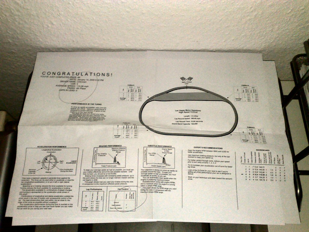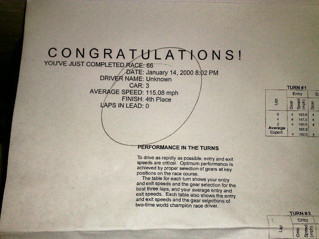 Zum Schluß gab es für jeden noch einen Ausdruck, wo die Platzierung, die Strecke und die Bestzeit draf gestanden hat. Ich hatte Plat 4th belegt, was angesichts des pixligen Games doch schon recht gut gewesen war.