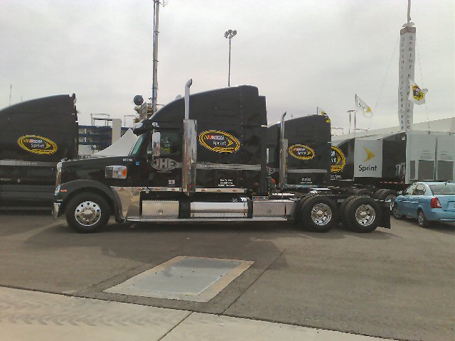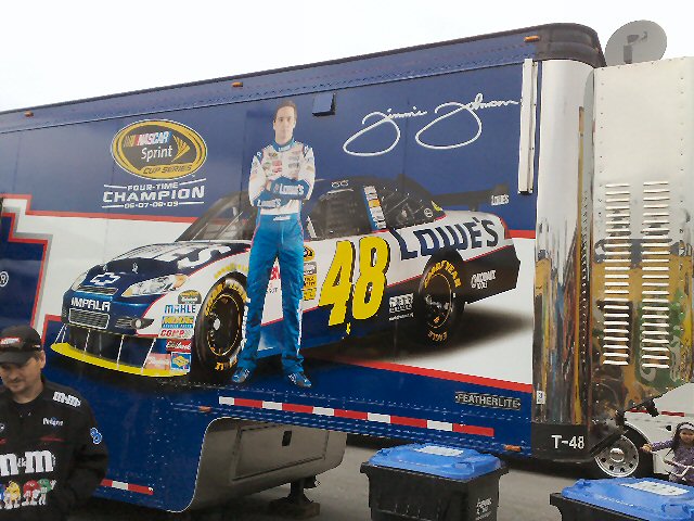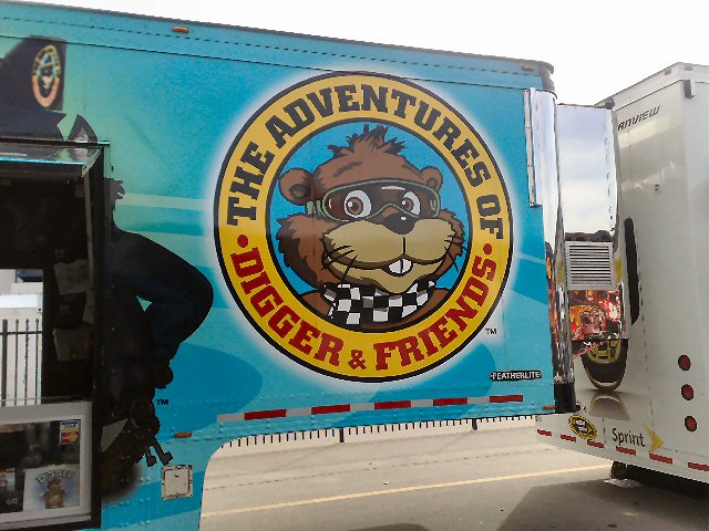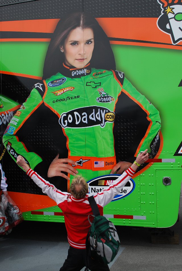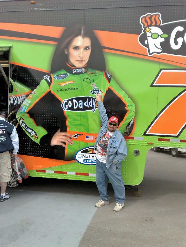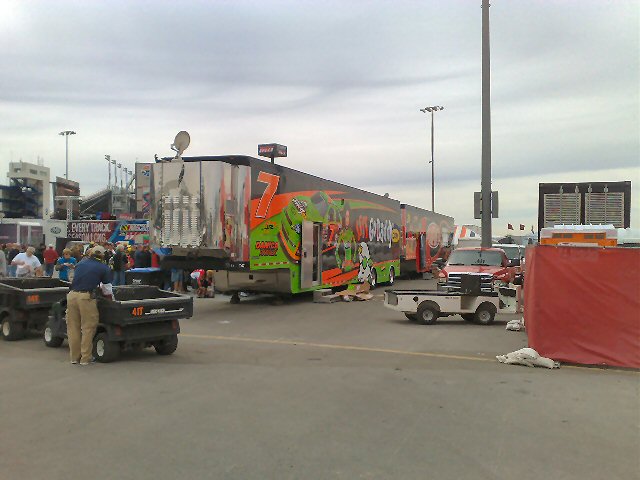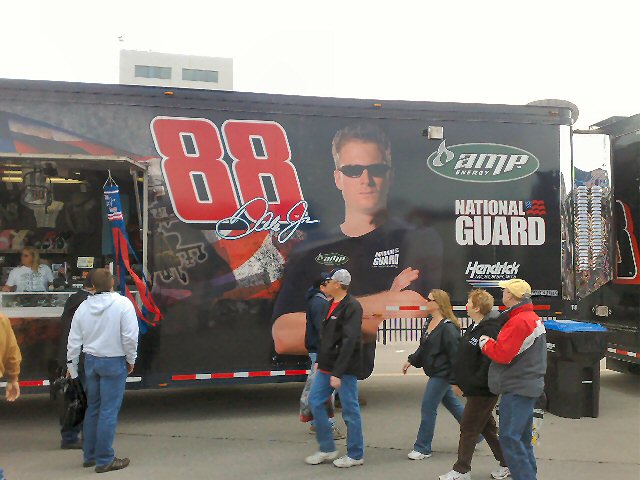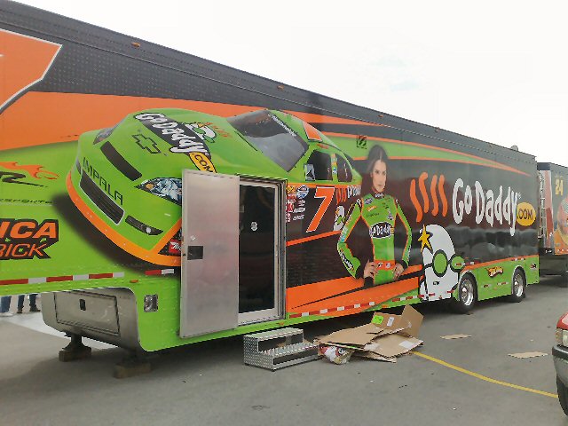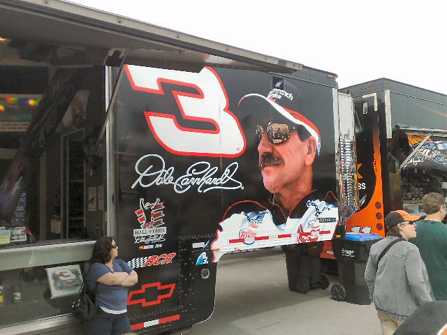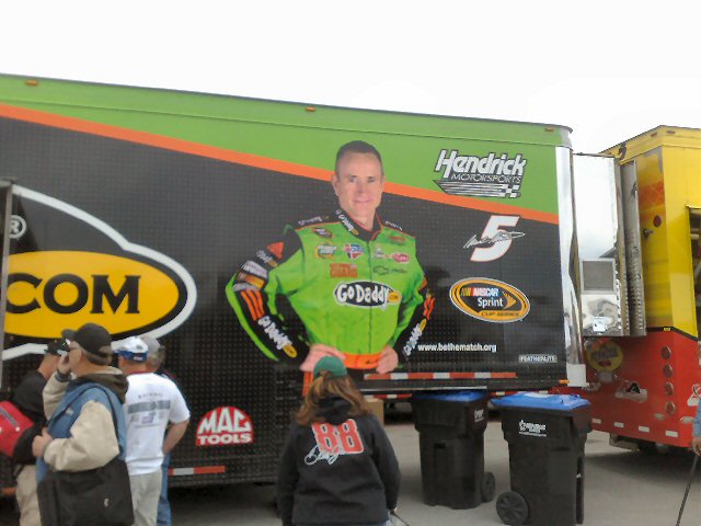 So jetzt hieß es aber langsam mal die Eintrittskarten abholen. Das lustige war ja, das Jo schon auf dem Parkplatz beim aussteigen sagte, das er als erstes erst die Karten abholen wollte bevor er irgend etwas anderes macht. Tja Jo der Plan ging ja mal komplett in die Hose, den auch du konntest dich kaum losreißen von den vielen coolen NASCAR, Trucks und Autos. Auf dem Weg zur Kartenausgabe gab es dann noch ein kleines / großes Hindernis zu überwinden. Den wir kamen direkt an den Trucks von Danica Patrick und Jeff Gordon lang. Das hieß die Karten wartet noch einmal kurz, wir kommen gleich, den wir müssen erst einmal zu den Trucks. So haben wir schnell mal geschaut und ein paar Fotos gemacht. Das verückte war, daß bei Danica am Truck eine Menschenmenge stand, die schon nicht mehr wahr war und bei Jeff Gordon grade mal zwei bis drei Leute. Ich weiß bis heute noch nicht warum das so war da ich denke nur weil es eine Frau ist muß man nicht so abgehen. Aber war trotzdem beeindruckend wie sie in USA aufgenommen wurde und es doch so viele Fans in der kurzen Zeit jetzt schon gab. Überings waren dort alle andern Trucks von den Fahrern auch recht leer so das die meisten am Danicas Truck standen.