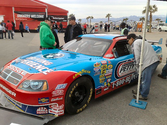 Keinen Augenschlag weiter stand die Richard Petty Driving Experience. Jo hatte am Vortag bei der Kyle Busch Autogrammstunde in der Warteschlange eine von dort kennen gelernt gehabt. Er hat sie auch gefragt gehabt ob wir dort noch einmal anrufen müssten bevor es am 02.03 los gehen kann. Die gute Frau sagte zu ihm das der Ausdruck in dem hervorgeht das alles bezahlt ist und eine bestimmte Nummer mit drauf ist völlig ausreicht. Sie hat Jo dann wieder erkannt und wußte anscheind auch wer ich bin, da Jo ihr erzählt hat, das er mit mir hier ist und deswegen fragen würde weil es so im Schreiben drin stand das man vorher anrufen muß. Ich fragte sie dann auch noch einmal genau und sie und Jo lachten weil ich noch mal sicher gehen wollte. Das gute war aber, daß ich das Schreiben grade dabei hatte und so es ihr zeigen konnte. Sie sagte mir dann auch das es genau das ist und die Nummer wäre ja drauf und dann ist alles gut. So war ich dann beruhigt das alles für den Ride Along geklärt war den immerhin hatte ich das komplett alleine in Deutschland gebucht gehabt. Die Frau war schon so nett das ich mich noch mehr gefreut habe auf den Event obwohl ich bis zu diesem Zeitpunkt nicht ein NASCAR gehört geschweige fahren gesehen habe, sondern nur im stehen. Ich fragte sie dann noch ob man mit dem COT Auto Fahren würde. Sie sagte dann nur nicht mit dem Petty COT da es ein richtiger Rennwagen ist, das heißt nur ein Sitz ist dort drin, es aber viele COT Cars geben wird. So auch von Kyle Busch und Danny Hamlin oder auch Kevin Harvick. Ich fragte sie dann noch nach einem Jeff Gordon. Da mußte sie mir aber leider sagen das der wohl nicht hier in Las Vegas dabei sein wird. Das fand ich schade aber war später dann nicht schlimm.
