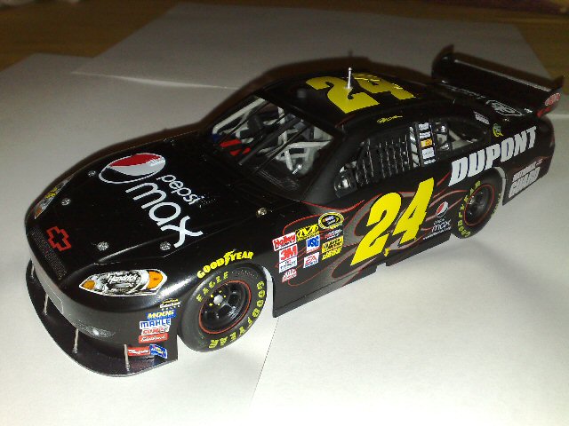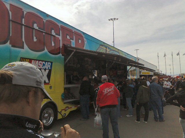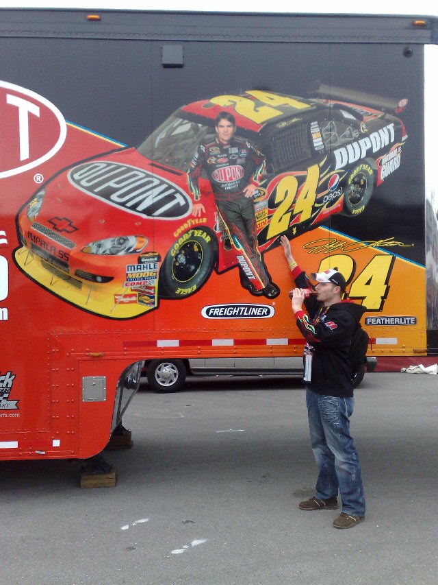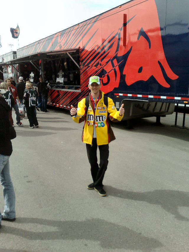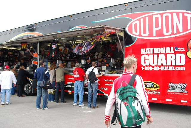 Da habe ich wohl die Rechnung ohne mich gemacht, den kaum wieder am Jeff Gordon Truck angekommen bin ich einem Kaufrausch verfallen. Was wichtig war, war das ich ein Diecast bekomme damit Jeff Gordon, so der Plan, ihn dann unterschreiben kann. Dabei ist es aber nicht geblieben. So habe ich sofort dem Verkaüfer verständlich gemacht das ich den 2010 PEPSI MAX haben möchte als ich den gesehn hatte. Ich war garnicht dran aber das war mir und auch ihm egal. Er sagte mir "Kein Problem es sei eine gute Wahl da er selber nur 12 Stück bekommen hatte" und das bei einem officiellen Verkaufstruck. So ging es dann weiter mit einem DuPont Flames Diecast von 2010 und einem Schlüsselanhänger und einem National Guard Cap und einem Band mit Kartenhalter und einem Pullover / Jacke DuPont Flames von 2009. Zusammen bin ich innerhalb von 5Min. über $250,00 los geworden. Aber es war richtig geil so einkaufen gehen zu können, vor allem Jeff Gordon Sachen und Modelle. So hatte ich mich komplett ausgestattet. Beachtet mal das Bild wo ich und Jo am Kartenschalter stehen und dann das wo ich vor dem Truck stehe ;). Der Rucksack war dann auch schon komplett voll von den ganzen Sachen und Modellen. So war ich dann stolzer Bestitzer von einem von 12 -2010 PEPSI MAX Diecast den JeffGordon auch in Las Vegas gefahren ist, was ich aber zu dem Zeitpunkt noch nicht wußte, sowie einem 2010 DuPont Flames. Bevor ich alles in den Rucksack gepackt hatte, habe ich noch mir überlegt welchen Diecast Jeff Gordon unterschreiben soll. Ich entschied mich dann für den DuPunt Flames 2010. Den öffnete ich dann auch schon, so das ich ihn jederzeit schnell auspacken könnte wenn ich Jeff sehen sollte. Das war mein bester Kaufrausch im Leben. Ich hätte auch gerne den ganzen Jeff Gordon Trailer gekauft aber leider wäre das doch etwas zu teuer geworden und so war ich bestens mit meinen Errungenschafften zufrieden.