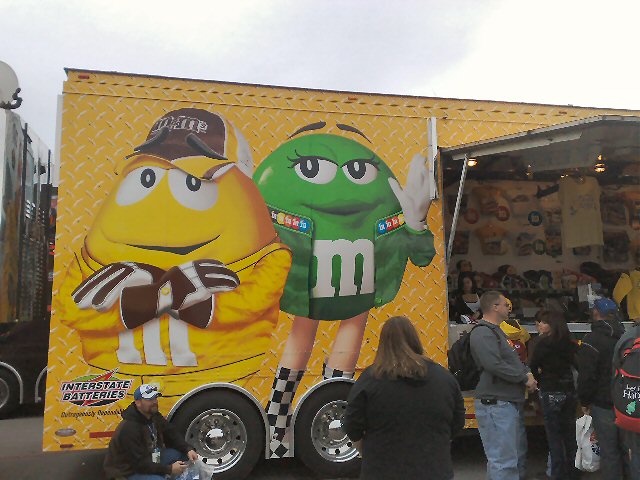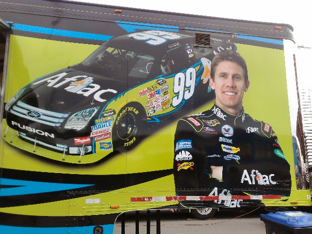 So jetzt wollte Jo aber auch erst einmal doch noch nach Kyle Busch Sachen schauen. So haben wir den Truck von Kyle Busch gesucht. Nebenbei habe ich dann noch ein Programm von Las Vegas inkl. 1/64 Diecast und T-Shirt für $15,00 gekauft. Dann haben wir den M&M Truck entdeckt. Leider waren da komischerweise die Schlangen ähnlich groß wie zuvor bei Danica. Ok wer Jo kennt weiß das ihn das nicht belasten kann und schon stand er an. In der Zeit habe ich mich noch ein wenig umgeschaut bei den ganzen ander Fahrern wie Jimmie Johnson, Mark Martin, Dale Earnhardt Jr., Carl Edwards, Kevin Harvick und vielen anderen. Beim Carl Edwards Truck fiel mir dann die "weltweit ausverkaufte" Aflac Ente auf. Wenn man ihr auf dem Schwanz drückt schreit sie AFLAAAAAAAAAC. Die habe ich gleich mitgenommen für ein paar Dollar. In der Zeit war dann Jo auch ferig. Er hat sich den gleichen Pullover / Jacke gekauft wie ich, nur eben von M&M und weitere Diecast wie einen 2008 Interstate Batteries Raced Version für unter $30,00. Eins muß man mal hier sagen. Die Preise waren wirklich sehr gut bei den Trucks, sogar meist weit unter dem wie in den Geschäften.
