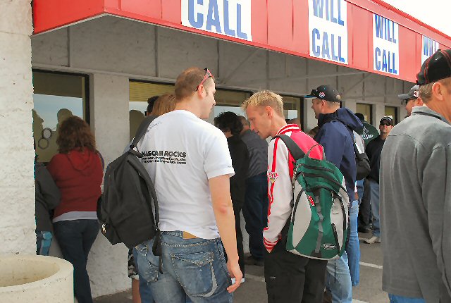 Aber jetzt wollten wir dann doch erst die lang ersehnten Karten abholen. So hieß es ab zum Kartenhäuschen und erst einmal warten da ja nicht nur wir die Idee hatten. Aber das war gar kein Problem da die Amis ja richtig entspannt sind auch wenn sie lange warten müssen. Außerdem waren ja alle Schalter auf und die Schlangen noch nicht groß so das es schnell gehen sollte. Dann waren endlich wir dran und die gute Frau am Schalter wollte meine ID haben. Mit ID meinen die Amis den Ausweiß. Ich dachte immer welche ID ich habe doch kein Passwort oder so, was möchte sie jetzt von mir. Das war im ganzen Urlaub echt schwer sich daran zu gewöhnen das es ID heißt statt Ausweis. Die Karten hat sie dann auch schnell gefunden und mir gegeben. Jetzt bekam ich noch ein gelbes Bändchen ums Handgelenk. Das war die Eintrittskarte in die NeonGarage. Jo sagte mir das ich es nicht abmachen könnte und wenn ich es aufschneiden würde, es am nächsten Tag Probleme geben wird. Ich dachte nur na wie geil jetzt muß ich drei Tage das überall mit tragen. Er fragte auch noch einmal nach und die Frau bestätigte ihm, das es wirklich so ist und es komplett die drei Tage dran bleiben muss. Ok dann ist alles geklärt und Jo hat seine Karten auch schnell bekommen, so das es jetzt zum Speedway rein gehen konnte.