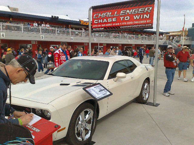 In der mitte von der NeonGarage stand ein nagelneuer Dodge Challender. Diesen konnte man gewinnen. Ich schaute ihn mir an und überlegte da mit zu machen. Das wäre doch was wenn Sonntag Jeff Gordon gewinnen würde und ich den Challenger und dann ihn mit nach hause nehmen würde. Ja war wirklich eine tolle Vorstellung doch ich habe es dann erst gelassen den wir wollten ja ins Infield. Außerdem sollte ja auch bald das Sprint Cup Qualifying sein. Aber es war eine geile Karre mit der ich mir hätte gut vorstellen können hier in Germany durch die Gegend zu crusen. Vorher wollten wir aber noch etwas essen, da wir den ganzen Tag noch nichts gegessen hatten. Das haben wir dann auch gemacht bevor es ins Infild gehen sollte.