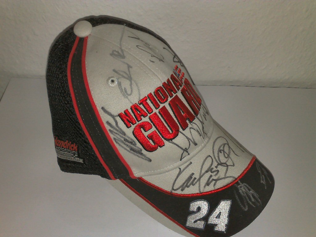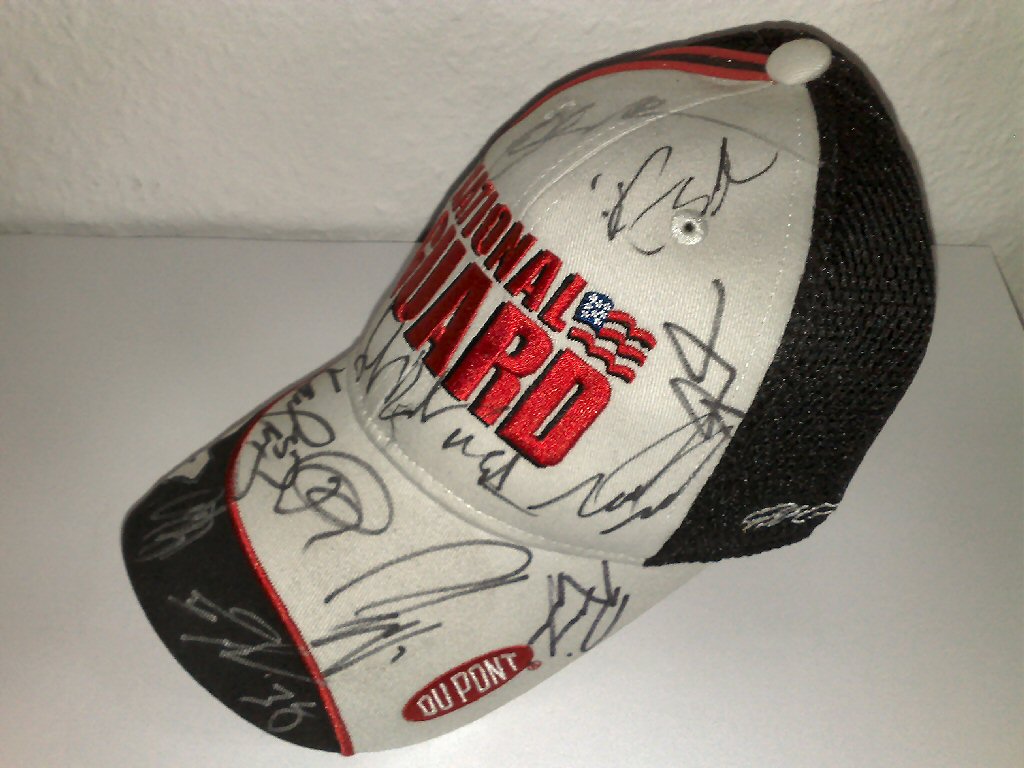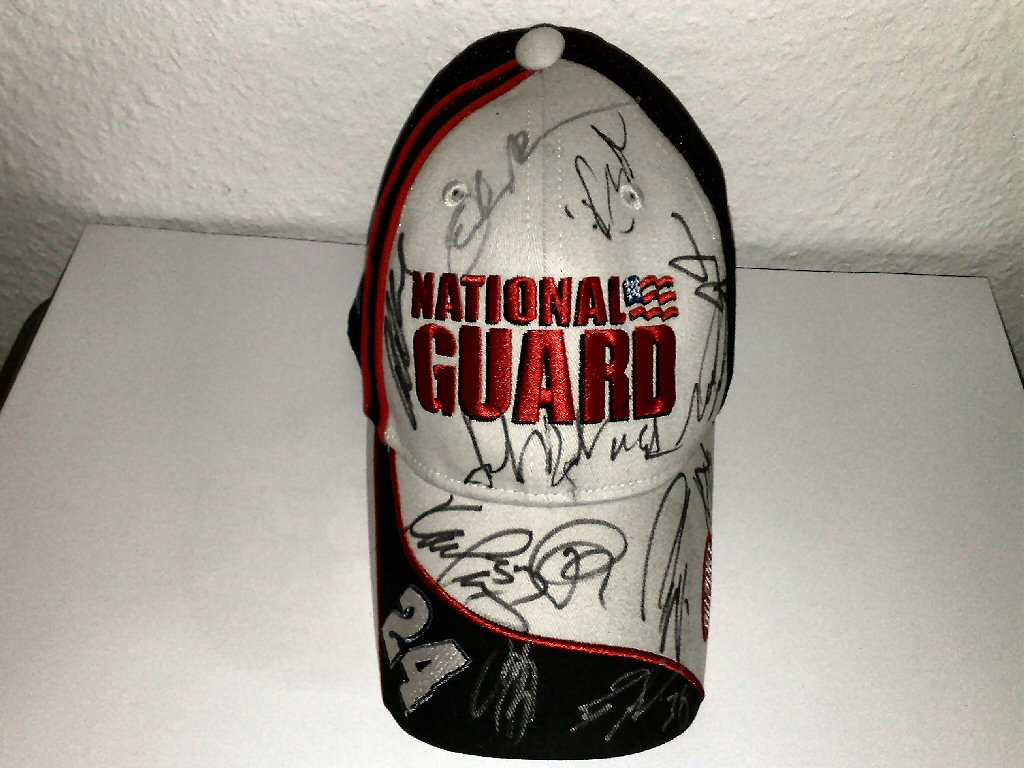 Das National guard Cap von Jeff Gordon. Gekauft habe ich es auch am Jeff Gordon Truck. Hier haben ca. 22 Fahrer und Teamchefs unterschrieben. angefangen mit #97 Kevin Konway, #7 Robby gordon, #71 Bobby Lobonte, #00 David Reutiman, #48 Jimmie Johnson, Rick Henrick, Jack Roush und viele weitere.