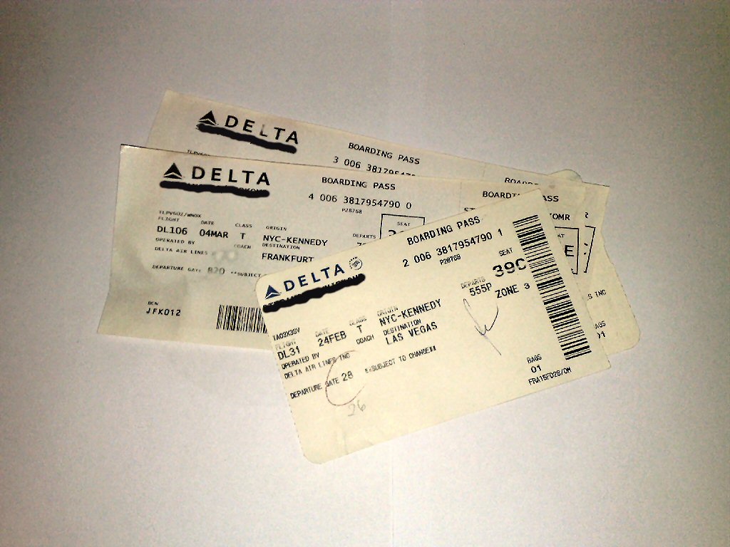 Links ist mein Pass mit dem Delta Airline aufkleber drauf - Mitte ist der Stempel, den man in New York bei der Einreise zusammen mit dem 3 Monats Visum bekommt - rechts das sind die Flugtickets