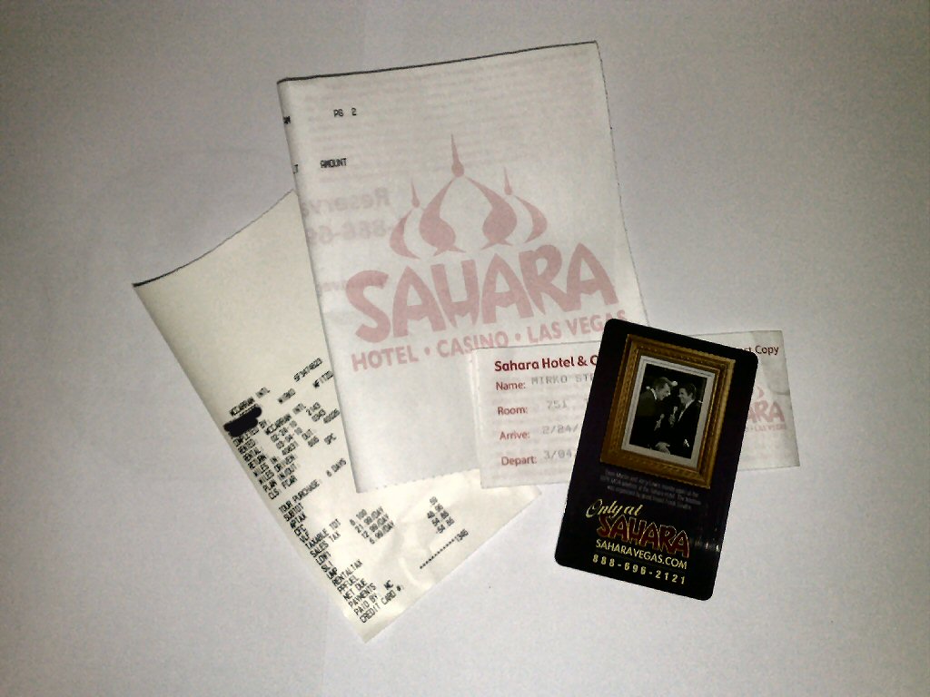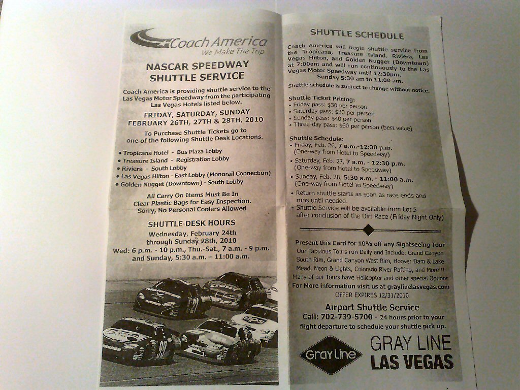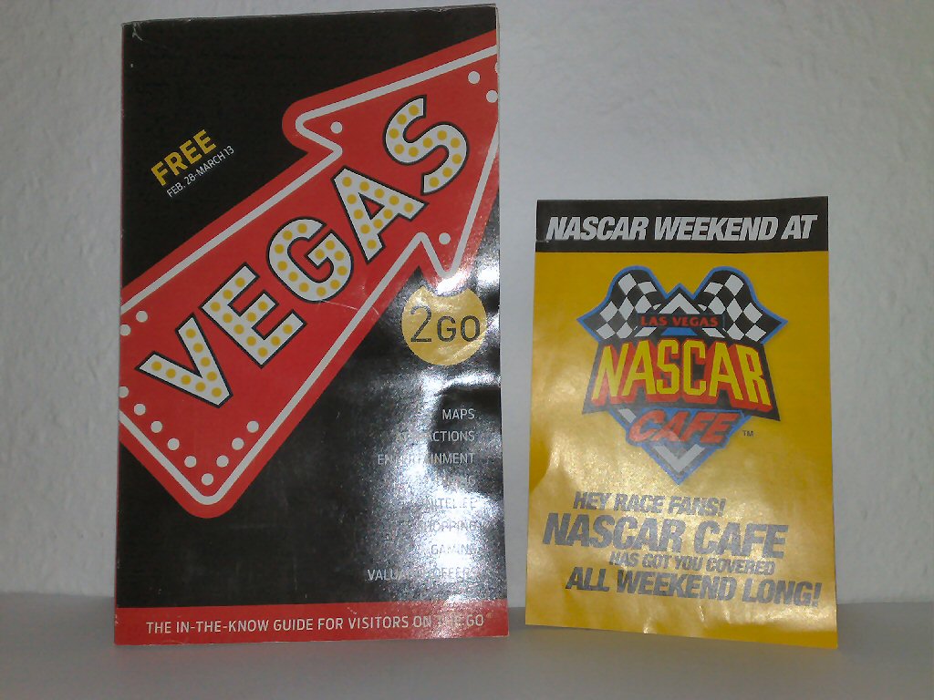 Links ist ein Las Vegas Guide und ein Werbezettel vom NASCAR Café - Mitte ist die Rechnung vom Hotel und die Schlüsselkarte vom Zimmer. Die durfte man bei der Abreise behalten - rechts ist ein Infoblatt vom Shuttleservice zum NASCAR Rennen und zurück zum Hotel