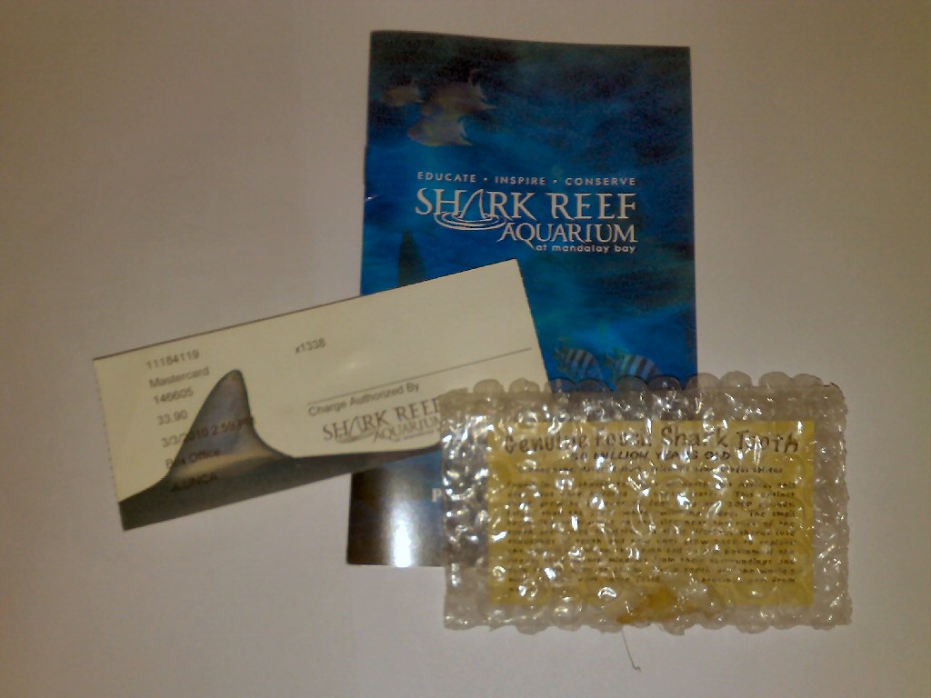 Das habe ich aus dem Mandalay Bay Shark Reef. Das ist das Prospekt und die Eintrittskarte - rechts ist ein original Hai Zahn den man dor kaufen konnte