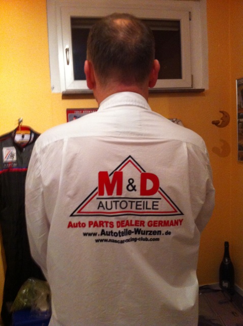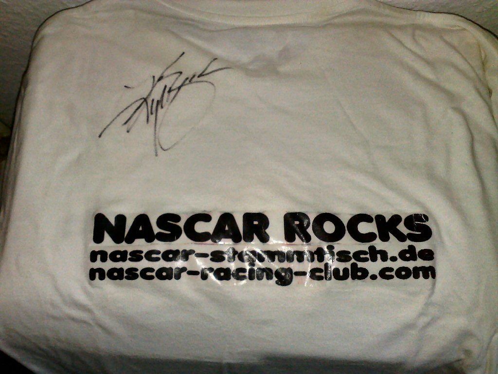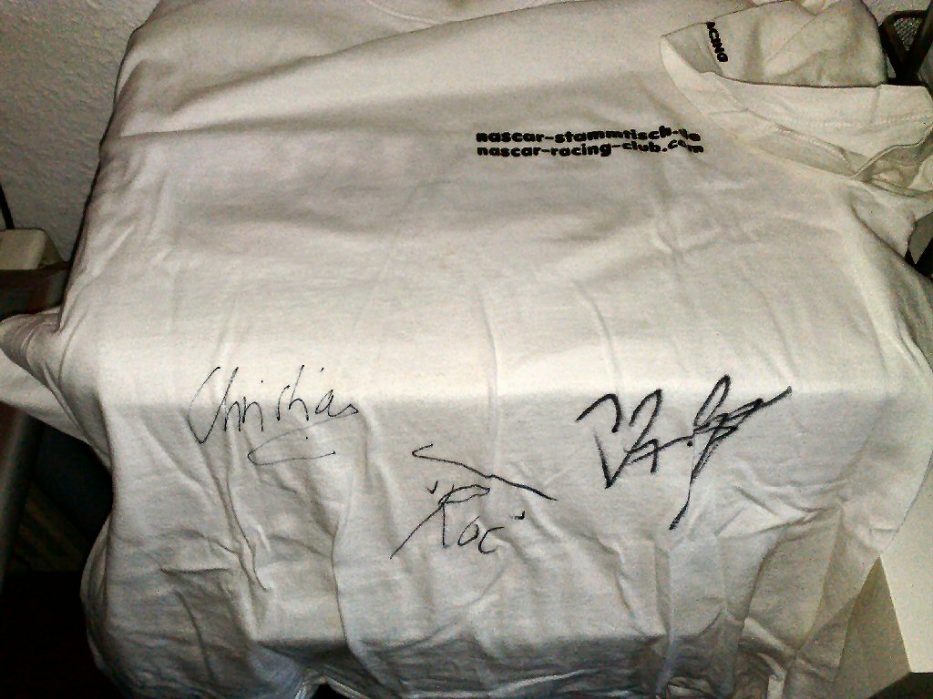 Dieses T-Shirt hatte Alex für uns gemacht. Es stehen unsere Internetadressen drauf. Auf dem oberen Bild sieht man die Unterschrift von #18 Kyle Busch. Auf Bild 2 in der Mitte ist die Unterschrift von Kid Rock. Er war im Infield beim Sprint Cup Rennen unterwegs. Das ist er ehemalige Man von Pamala Anderson. die andern bein Unterschriften sind aus Oscherleben 2011. Dort hatte ich das Shirt auch an und links hatte Chistian Fischer vom Honda Team unterschrieben und rechts ein Lambo Fahrer mit der Nummer #24