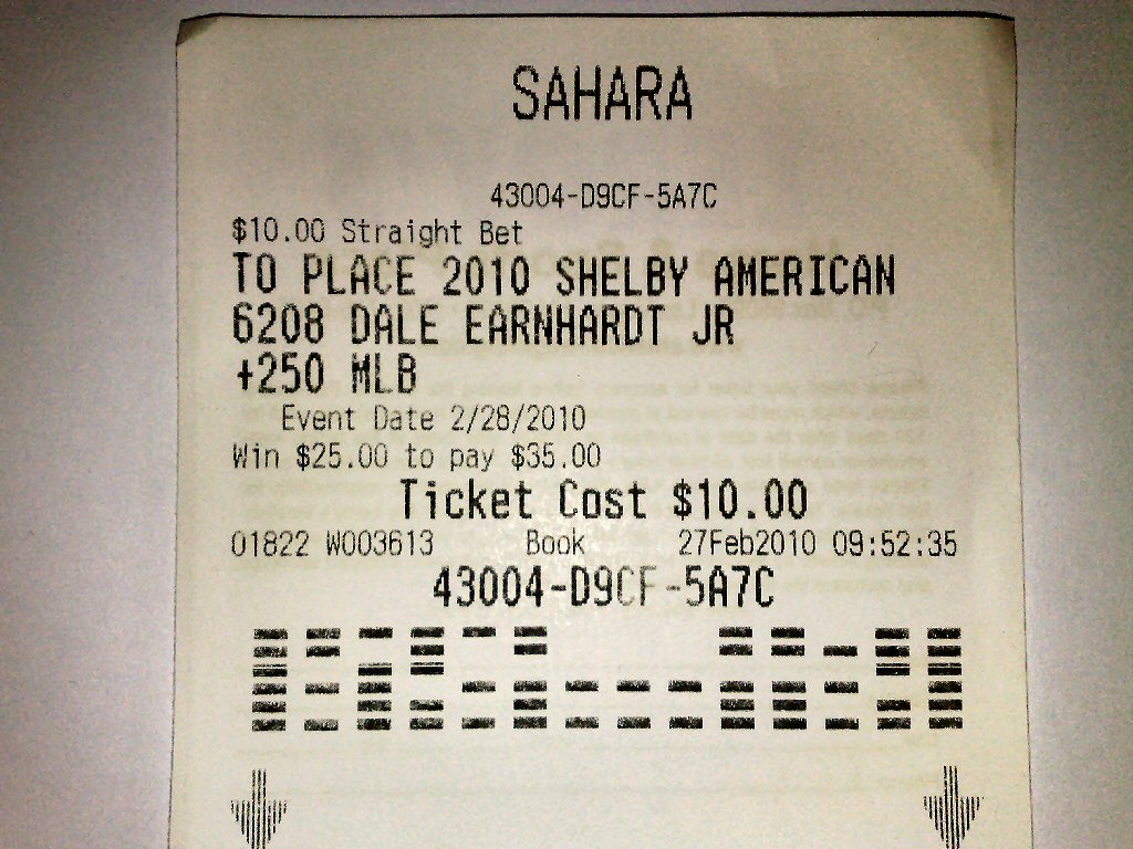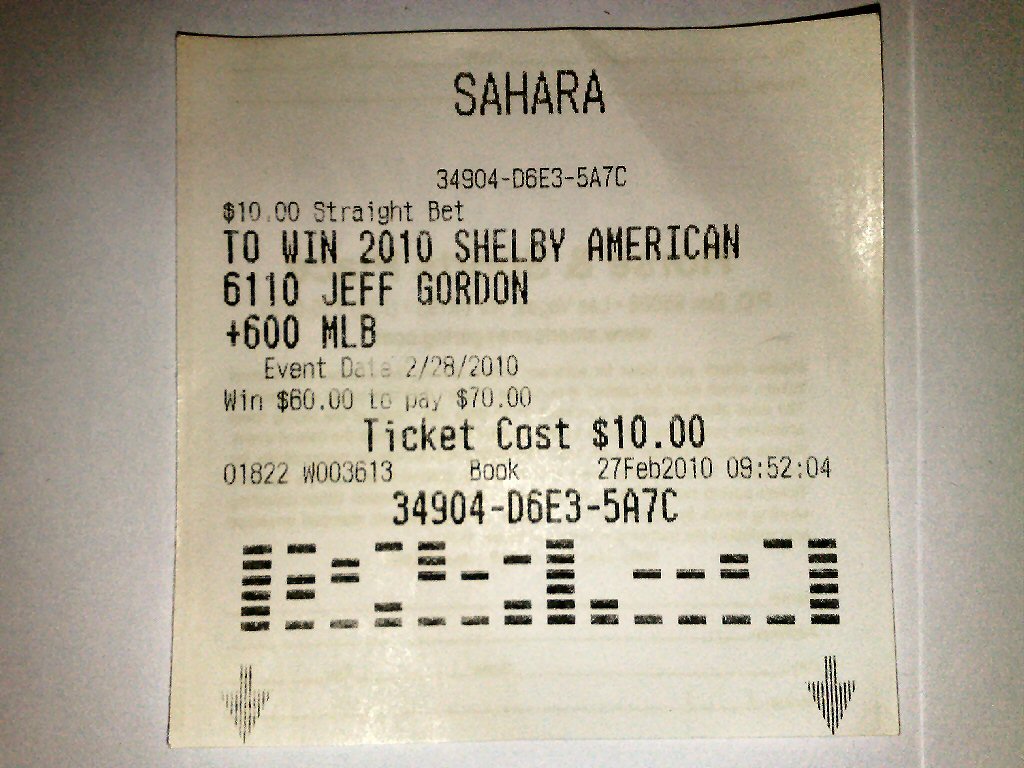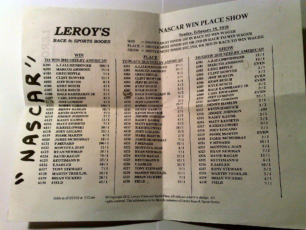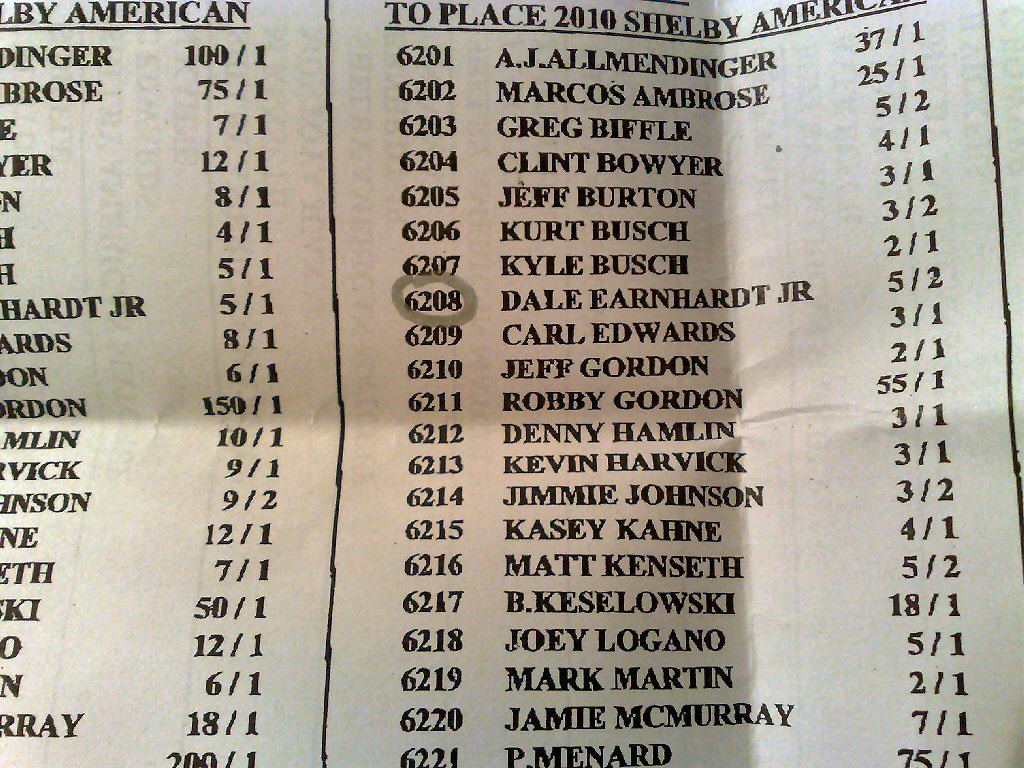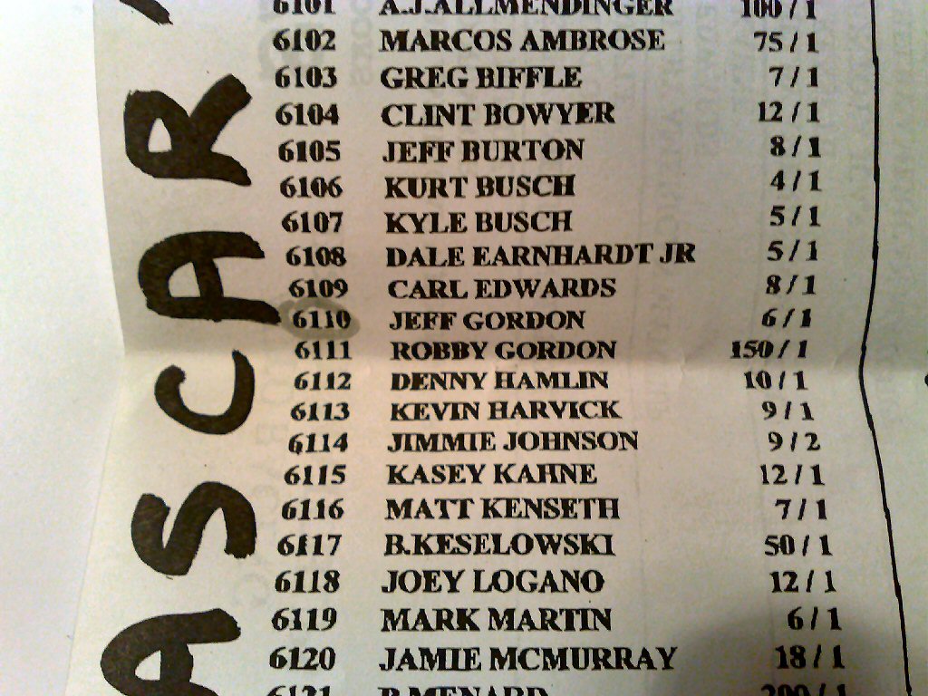 Das hier sind meine beiden Wettscheine. Mit #24 Jeff Gordon hätte ich fast $60.00 gewonnen. Leider wurde er 16 Laps vor Ende des Rennen ja von #48 Jimmie Johnson überholt und wurde so nur dritter, obwohl er das ganze Rennen geführt hatte. Immerhin war es ein neuer Recorde auf der Strecke was die Führungsrunden angeht. Unten sind die listen mit den Fahrern und den Quoten