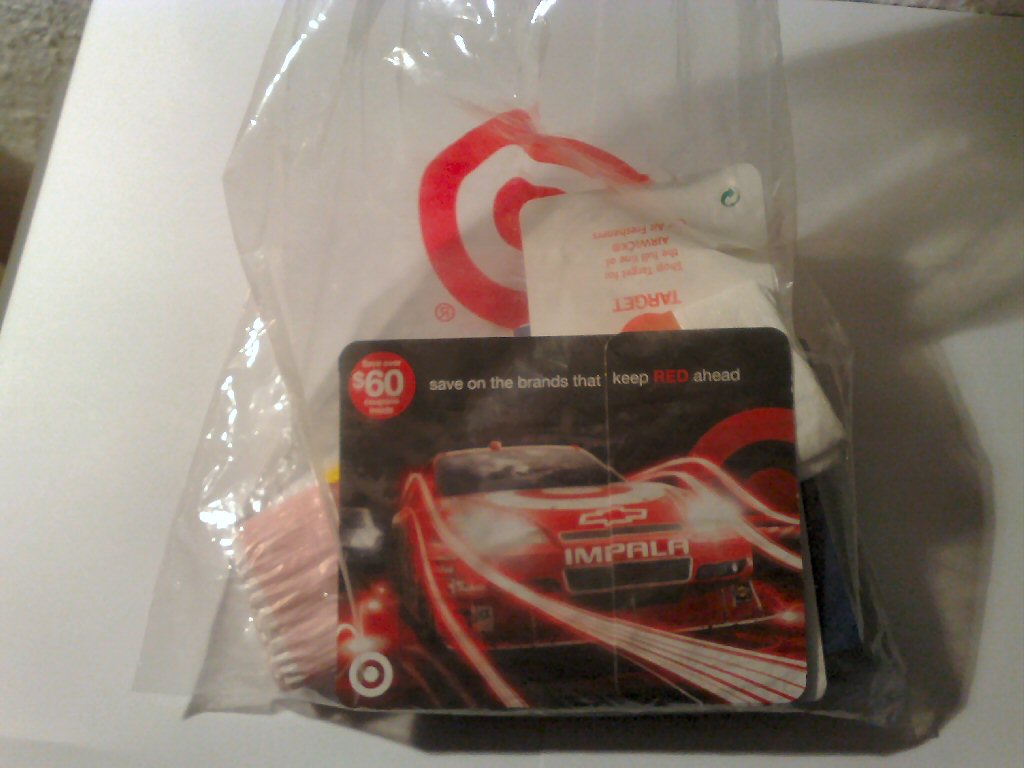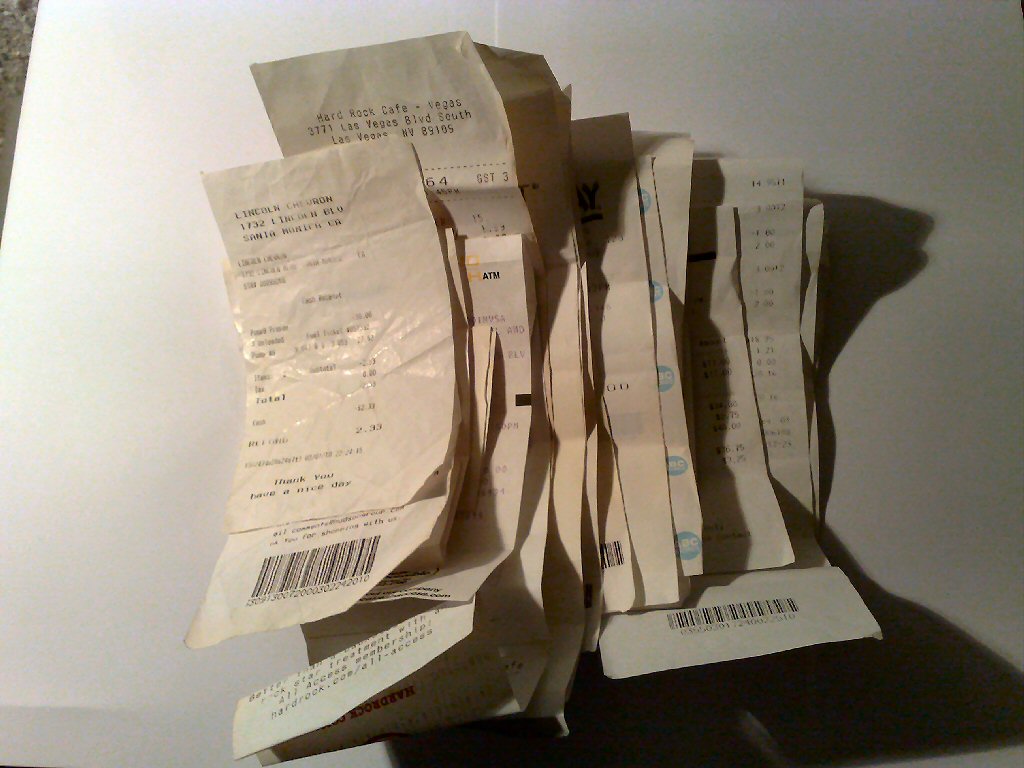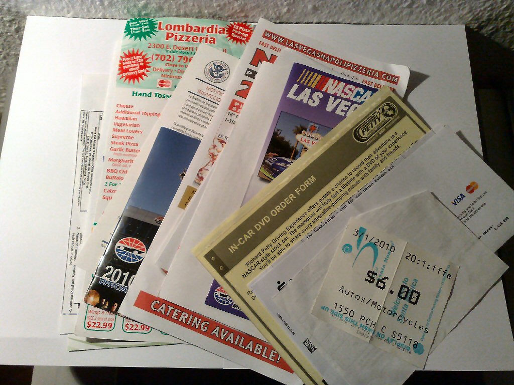 Links ist eine Tüte ( habe noch ganz viele wie z.B. M&M usw. ) von Sprint. Die gab es an einem Truck auf dem Las Vegas Motor Speedway - Mitte sind etliche Werbezettel die ich von überall her mitgenommen hatte. Auch Pizzakarten aus L.A. sind dabei - rechts sind alle meine Quittungen von den gekauften Sachen