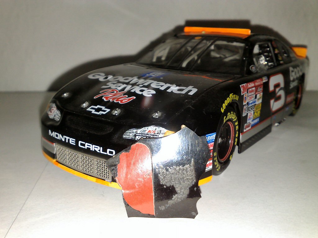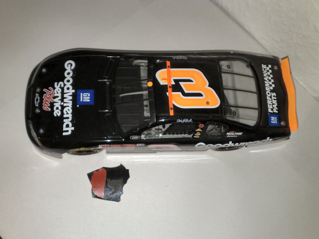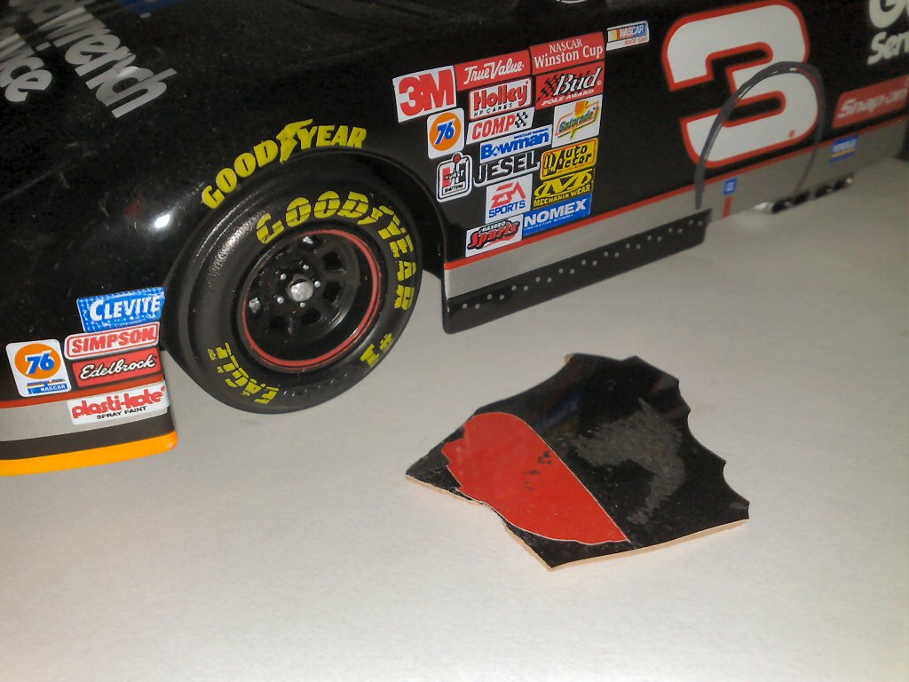 Das hier ist was ganz besonderes, das Auto gehört nicht dazu, dient nur zum Vergleich. Das kleine Stück Lack ist vom original Dale Earnhardt Sr. Winston Cup Wagen von 1998. Er stand im NASCAR Café und dort habe ich es vorne vom Chevy Zeichen ab gemacht. Eine tolle Erinnerung an Las Vegas und Dale Earnhardt Sr..