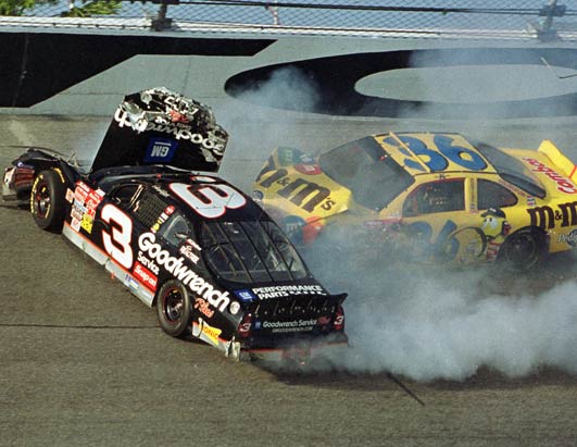 Während Michael Waltrip, dicht gefolgt von Earnhardt Jr., seinem ersten Sieg entgegen fuhr, rutschten die Wagen von Earnhardt und Schrader in Kurve vier hinunter ins Gras. Nachdem Schrader aus seinem Wagen geklettert war, schaute er in Earnhardts Wagen. Sofort signalisierte er die benötigte Unterstützung durch einen Notarzt. Während die Notfallmediziner an der Unfallstelle Earnhardt versorgten, fragte FOX-Reporterin Jeanne Zelasko Schrader über den Zustand von Earnhardt. „I’m not a doctor, but I got the heck out of the way as soon as I got there.“ („Ich bin kein Arzt, aber ich bin sofort aus dem Weg gegangen, als ich da war.“), gab dieser daraufhin als Antwort. Earnhardt wurde ins Halifax Medical Center gebracht, nachdem er aus seinem Wagen befreit wurde. Einige Stunden später verkündete NASCAR-Präsident Mike Helton auf einer Pressekonferenz: „Undoubtedly this is one of the toughest announcements I’ve personally had to make. After the accident in Turn 4 at the end of the Daytona 500, we’ve lost Dale Earnhardt.“ („Zweifelsohne ist dies eine der schwierigsten Bekanntgaben, die ich persönlich machen muss. Nach dem Unfall in Kurve 4 am Ende des Daytona 500 haben wir Dale Earnhardt verloren.“) FolgenEarnhardts Tod war der Auslöser für eine Reihe von Veränderungen in NASCAR. Nach seinem Tod gab es sowohl eine polizeiliche Untersuchung als auch eine Untersuchung seitens NASCAR. Nahezu jedes Detail des Unfalls wurde veröffentlicht, vom Fund eines gerissenen Sicherheitsgurts in Earnhardts Wagen bis hin zu grafischen Darstellungen der Verletzungen, die der Fahrer zum Zeitpunkt des Einschlags erlitten hat. Es gab das Gerücht, dass er seinen Sicherheitsgurt nicht korrekt angelegt habe, da er ihn gerne etwas lockerer hatte und so mehr Bewegungsfreiheit im Wagen hatte. Die Behauptungen eines Versagens des Sicherheitsgurtes führten dazu, dass Bill Simspon aus seiner Firma ausschied, die die Sicherheitsgurte in Earnhardts Wagen sowie nahezu jedem Rennwagen in NASCAR herstellten. Mehrere Pressekonferenzen wurden in den Tagen nach Earnhardts Tod abgehalten. Einige Fans schrieben Drohbriefe an Sterling Marlin und gaben ihm die Schuld an dem Unfall. Nach deren Bekanntwerden sprach Earnhardts Sohn Dale Jr. Marlin von jeder Schuld frei. Teambesitzer Richard Childress zog umgehend Earnhardts Wagen mit der Startnummer 3 zurück und versprach öffentlich, die Startnummer 3 niemals wieder auf der Seite eines schwarzen, von GM Goodwrench gesponserten Rennwagens dem Farbschema, mit dem Earnhardt seit 1988 unterwegs war zu verwenden. Das Team feierte seine Wiedergeburt unter der Startnummer 29 mit demselben Sponsor aber einem anderen Farbschema in den darauffolgenden Rennen in Rockingham und Las Vegas. Für das Rennen in Atlanta wurde ein neues GM-Goodwrench-Farbschema mit gewinkelten roten Streifen und einem dünnen blauen Streifen eingeführt, welches dem Farbschema entsprach, welches von Childress AC Delco in der Busch Series eingesetzt wurde. Kevin Harvick, der für Childress im zweiten Jahr in der Busch Series fuhr, wurde als Nachfolger für Earnhardt ernannt. Sein erstes Rennen nach Earnhardts Tod fuhr er auf dem North Carolina Speedway. Besondere Hüte mit der Startnummer 3 wurden an jeder Person an der Rennstrecke zu Ehren von Earnhardt verteilt und das Team trug die erste Zeit schwarze Uniformen. Zudem nahmen es die Fans selbst in die Hand, Earnhardt zu ehren, indem sie drei Finger in der jeweils dritten Runde in jedem Cup-Rennen in die Luft halten. Die Fernsehübertragungen von FOX und NBC legten zudem in jeder dritten Runde in den Rennen von Rockingham bis zum nächsten Daytona 500 eine Schweigeminute ein. In den ersten drei Wochen nach Earnhardts Tod sorgten zudem Vorfälle auf der Strecke dafür, dass jeweils in Runde drei die Gelbe Flagge gezeigt wurde. Drei Wochen nach Earnhardts Tod gewann Harvick sein erstes Rennen im Winston Cup in Atlanta in einem Wagen, der für Earnhardt vorbereitet worden war. In der letzten Runde des Cracker Barrel Old Country Store 500 bezwang Harvick in Atlanta Jeff Gordon um 0,006 Sekunden. Bei vielen NASCAR-Fans sind die Bilder unvergessen, wie Danny Myers, der langjährige Tankwart von Earnhardt nach dem Sieg geweint und Harvick auf der Zielgeraden seinen Burnout mit drei ausgestreckten Fingern aus dem Fenster absolviert hat. Startnummer 3 |