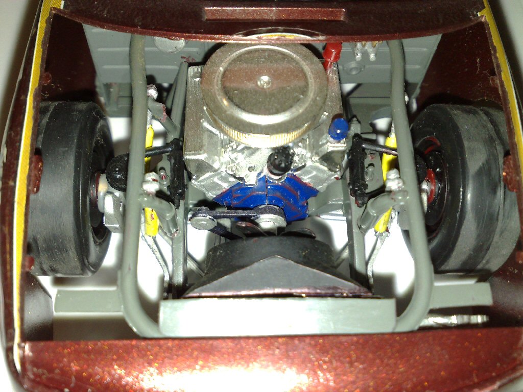 Der Blick unter die Motorhaube. Hier ist der V8-Big-Block drin komplett mit Luftfilter, dem Block und Ventieldeckel, Zahn- und Keilriehmen, dem Kühler komplett mit Lüfter
