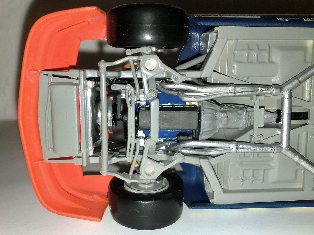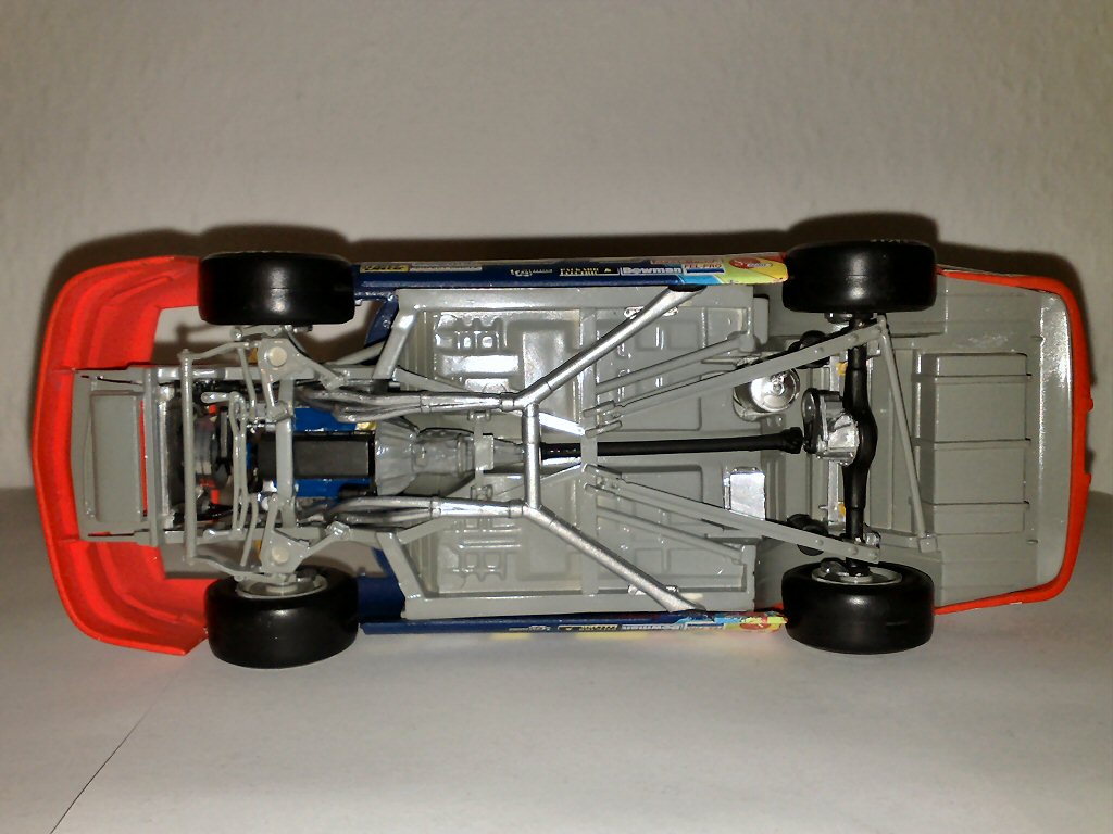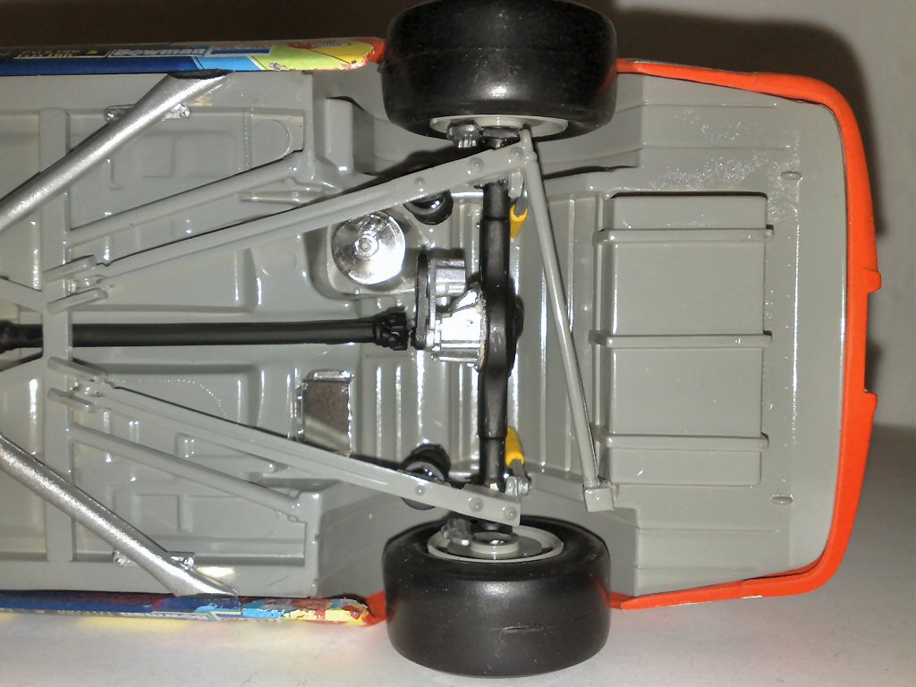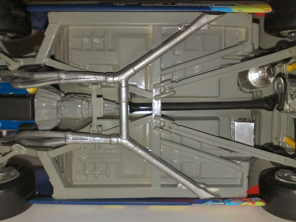 Von unten gibt es noch ein paar Details. So haben wir hier die Vorderachse, Ölwanne, Getriebe, beide Krümmer mit Auspuffanlage, Kardanwelle, Hinterachse, Differenzial, Trackbar und den Tank