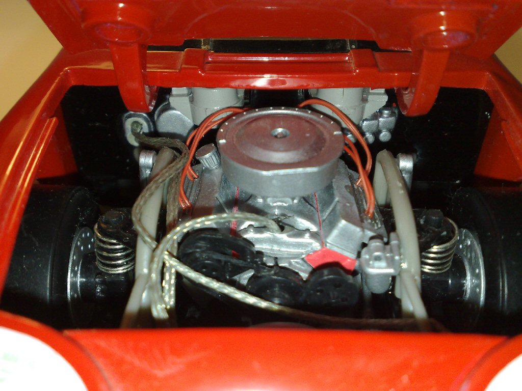 Wieder Elite Details vom feinsten. Der Motor ist komplett verkabelt mit allem was dazu gehört wie den Zündkabeln oder den Kühlerschläuchen usw.. Er hat einen Luftfilter den Kühler selber mit Kühlerrad. Hier ist auch schon an der Vorderachse zu erkennen, daß diese richtige Federn hat und auch die Bremsscheiben. Der Motorblock ist Rot. Auch vorhanden die Ventildeckel, der Keil und Zahnriemen.