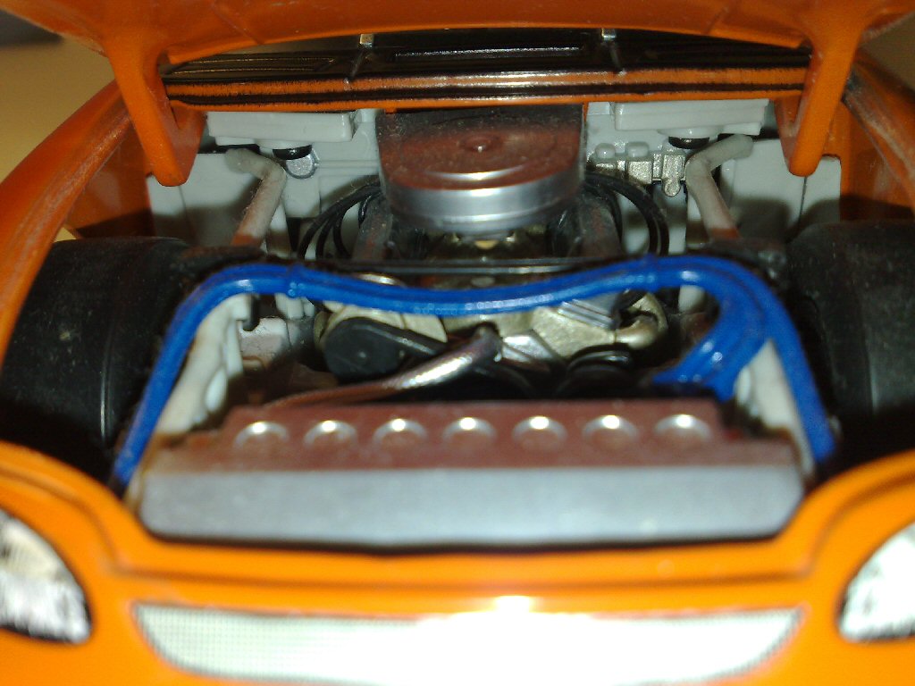Gut zu erkennen der fette V8 Motor. Der Luftfilter ist vorhanden sowie die Zündkabel, Kühlerschläuche, Zahn und Keilriehmen und div. anderer Kabel