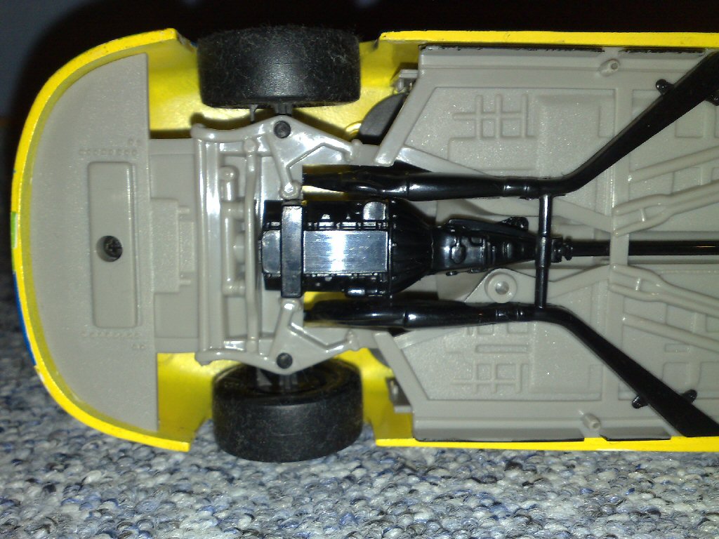 Von unten. Die Grundplatte ist ein Teil. So sind hier wie beim Truck und auch beim Trailer die Achsen in die Grundplatte eingelassen und keine eigenen Teile. Hier ist der Motorblock und das Getriebe von unten zu sehen und auch ein eigenes Teil sowie auch die Krümmer und der Auspuff und die Kardanwelle