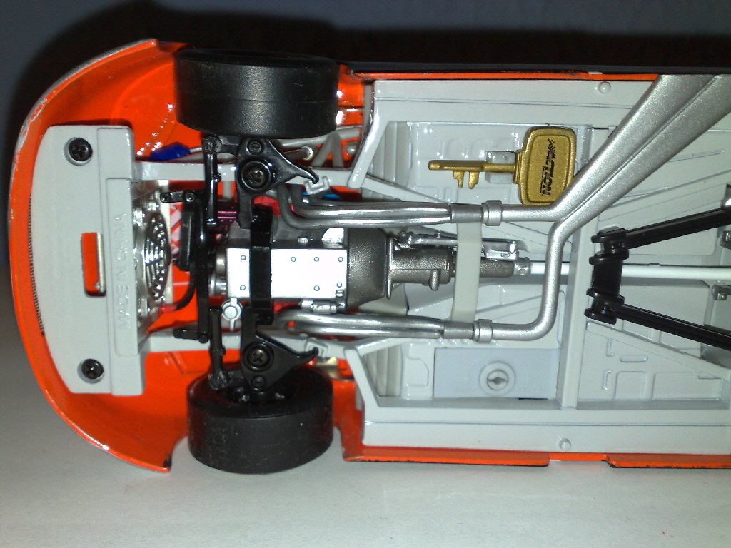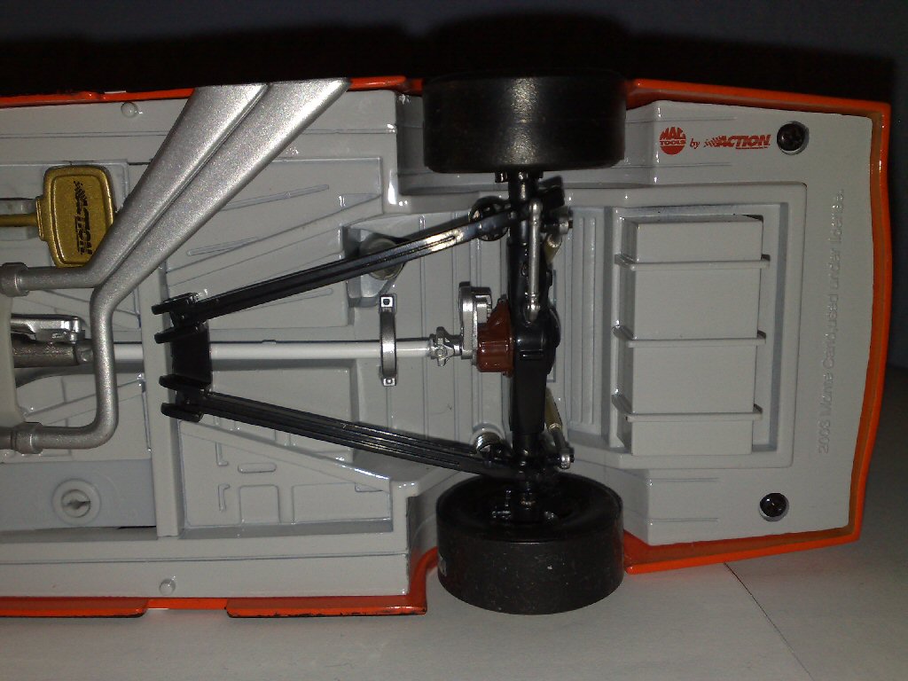 Von Unten. Hier sind sehr viele Details wie das Kühlerlufterrad, die komplett gefederte und lenkbare Vorderachse, die Oilwanne, das Getriebe samt Schaltgestänge, die Kardanwelle mit Schutzbügel, beide Krümmer mit kompletter Auspuffanlage, das Diffirenzial, die komplette Hinterachse mit Federn Stoßdämpfern, die komplette Bremsanlage an beiden Achsen und der Tank. Besonderheit hier, ist der kleine goldene Schlüssel womit man das kleine Fach unten rechts öffnen kann um das Geld wieder raus holen zu können