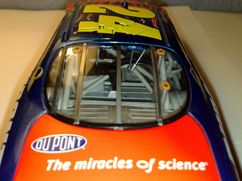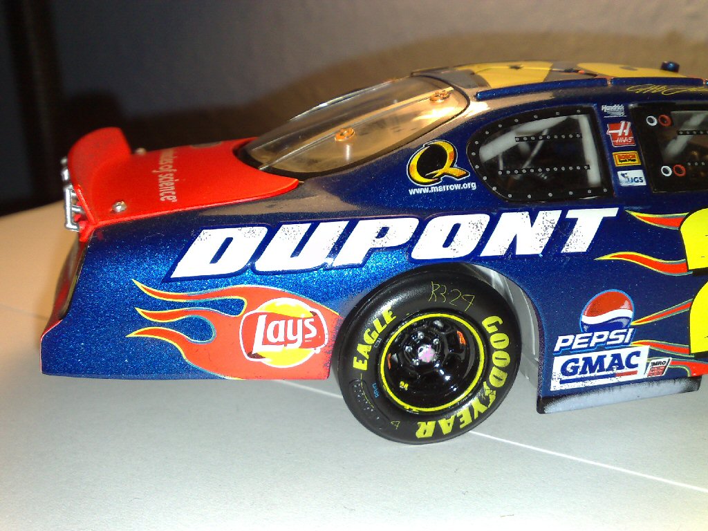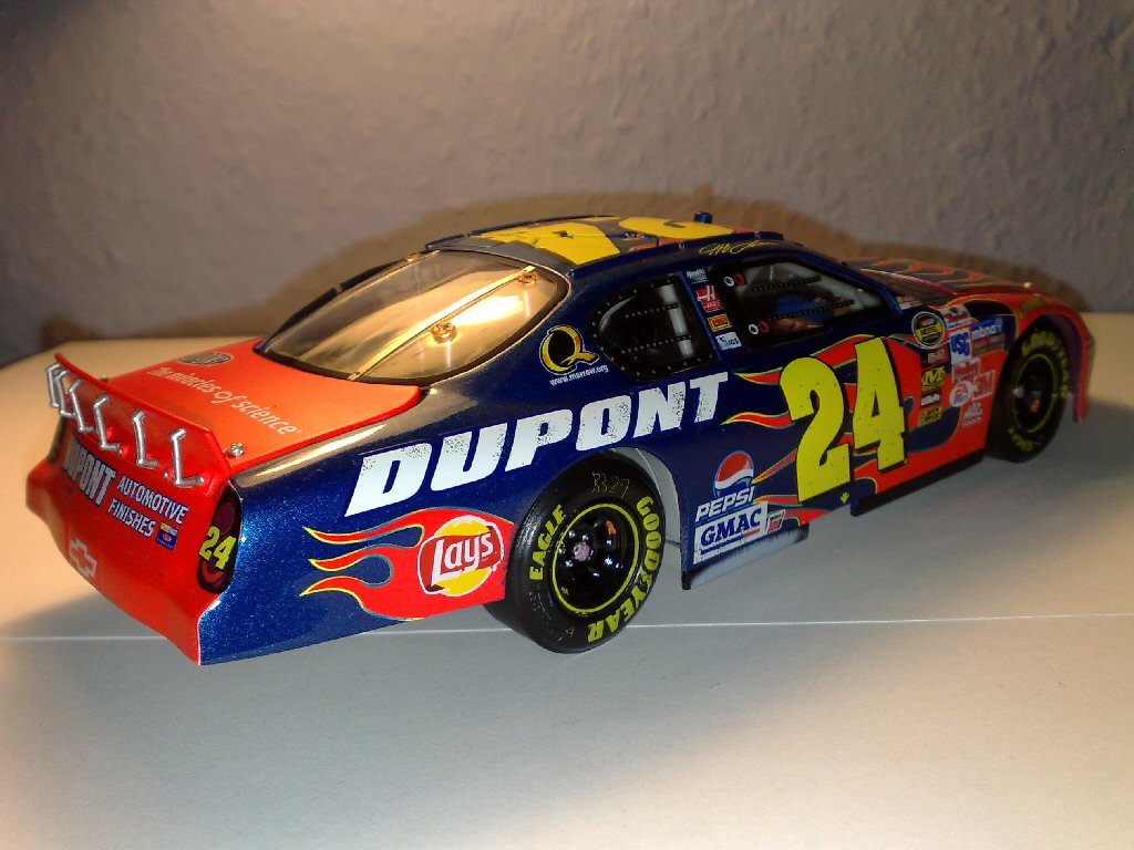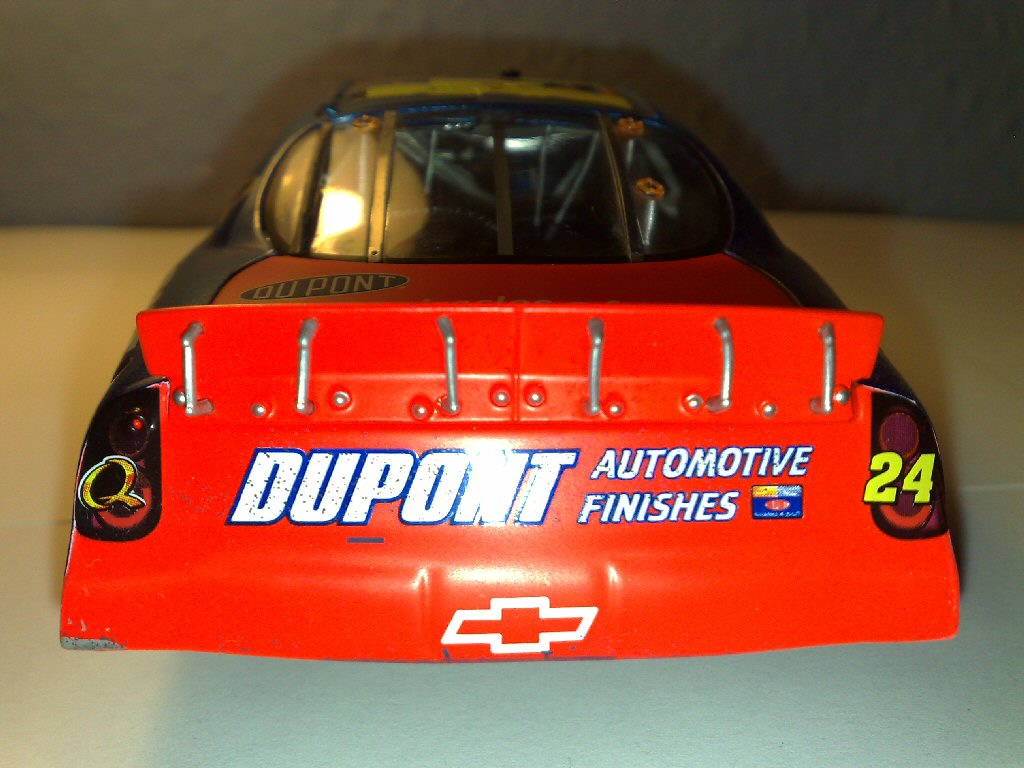 .2005 JEFF GORDON DUPONT FLAMES DAYTONA 500 RACED WINSeite 4 / 9Hier nocheinmal das Heck aus einer anderen Perspektive. Auch unterm Chevy - Zeichen sind Abschürfungen zu erkennen