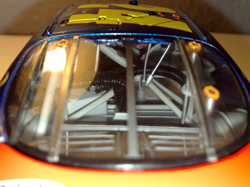 Ein Blick durch die Heckscheibe. Hier ist wirklich alles vorhanden was vorhanden sein kann. Alle Schläuche zur Kühlung von den Roof - Flaps die Streben, der Feuerlöscher, der Käfig und die Löcher für die Track - Bar in der Heckscheibe