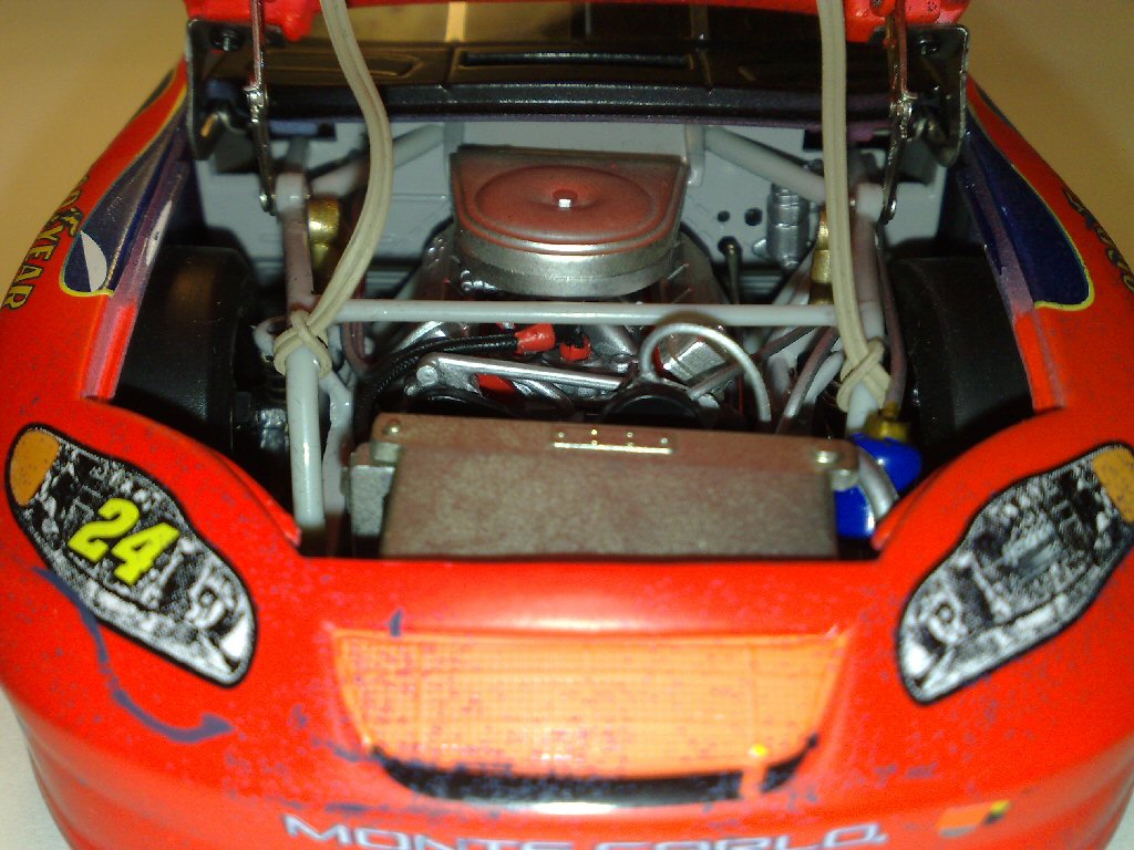 Unter der Motorhaube befindet sich der fette V8 Motor. Er hat sehr viele Details wie, Kühler samt Kühlerrad und Schläuche, Luftfilter, der Block mit dem Kopf und den Ventildeckeln, Keil und Zahnriemen, Zündkabel und div. anderer Kabel und Schläuche
