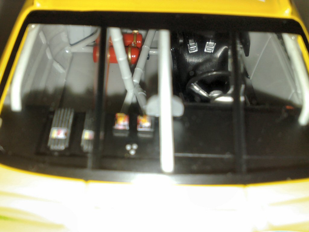 Der Blick durch die Frontscheibe. Hier sieht man den Fahrersitz mit Gurt, den Feuerlöscher, die Klimabox und weitere Teile vom Käfig