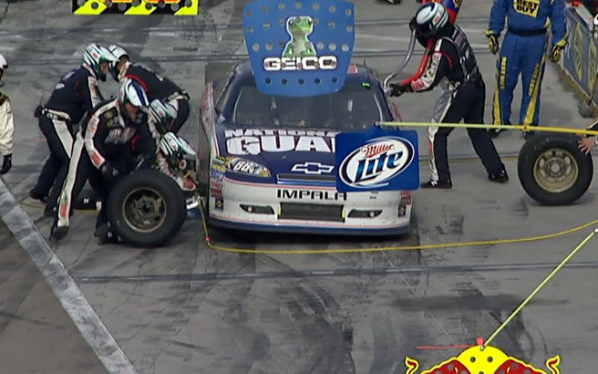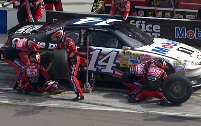 Gegen Ende des Rennen gab es dann Green Stops. Tony Stewart ist als erstes reingefahren und holte sich vier neue Reifen ab. Seine Verfolger #42 Juan Montoya und #99 Carl Edwards haben sich nur zwei Reifen beim Stop abgeholt. Dadurch konnten die beiden viele wichtige Sek. einsparen und die Führung übernehmen. Das heißt Carl Edwards führte nach den ganzen Stops vor Montoya und Stewart. Smoke versuchte alles um wieder nach vorne zu kommen. Schnell kam er an Montoya dran, aber nicht vorbei.