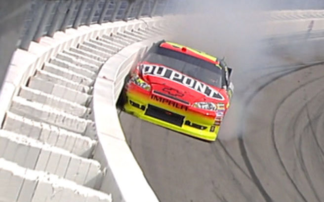 Eine der letzten Caution gab es durch #24 Jeff Gordon. Er hatte einen fatalen Reifenschaden und kanllte dabei heftig in die Mauer mit seinem DuPont Chevy.