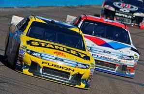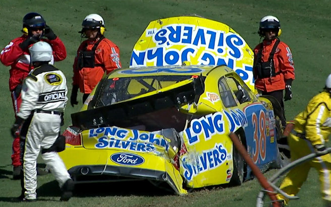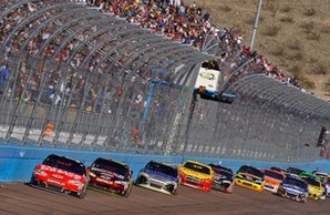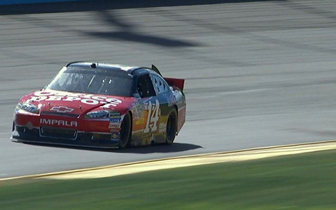 Dieses sollte habe hier im Sprint Cup Rennen ganz anders werden. Gute 60 Laps nach dem Start hat sich Daytona 500 Sieger #21 Tevor Bayne in die Außenmauer verabschiedet. Er mußte das Rennen damit frühzeitig aufgeben. Ein wenig später wurde Polesitter #99 Cale Edwards unsanft gebeten Platz zu machen. Daraufhin mußte Edwards sein Auto wieder unter kontrolle bekommen weil er von innen noch oben driftete und drohte in die Außenmauer zu knallen. In dem Augenblick wollte #24 Jeff Gordon oben noch an Edwards vorbei, schaffte es aber nicht ganz und wurde so von Edwards mit in die außenmauer genommen. Gordon der auf Platz 28 gestartet war, fuhr zu diesem Zeitpunkt schon vorne mit. Edwards mußte aber in die Garage, weil sein Auto viel abbekommen hatte, wären Gordon bis auf ein paar Strips nichts weiter hatte und weiter fahren konnte.