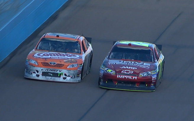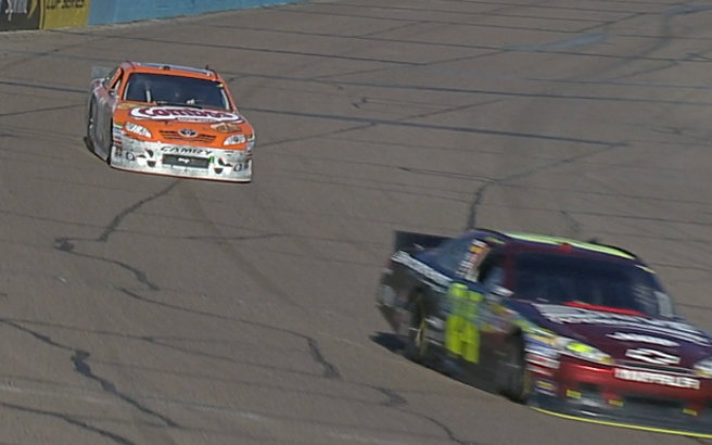 9Laps noch zu fahren und Gordon zog innen rein, berührte Busch ganz leicht am Heck. Dieser mußte korriegieren. Dabei konnte sich Gordon neben Kyle Busch setzten. Beide berührten sich noch einmal parallel, doch Gordon ist an Busch vorbei gekommen. Diese Führung fuhr er dann bis ins Ziel.