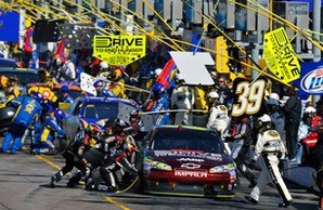 Jetzt legte auf einmal auch #18 Kyle Busch einen Zahn zu und holte sich einen Platz nach dem anderen. Auf Platz zwei liegend gab es weitere Green Stopps. Kyle Busch ist als erstes rein gegangen. Er hatte einen guten Stopp. Eine Runde später kahm dann auch Jeff Gordon rein. Er hatte leider das Problem das er #2 Bred Kesselowski vor sich hatte. So verlor er ein wenig Zeit. Auf einmal lag Gordon keine 20 Runden vor Schluß auf Platz 3 obwohl er schon über 100 Laps geführt hatte. Ganz vorne waren Kyle Busch und Tony Stewart und auf vier, weil es auch vorher Probleme mit dem rechten Vorderreifen in der Box gab, #48 Jimmie Johnson.