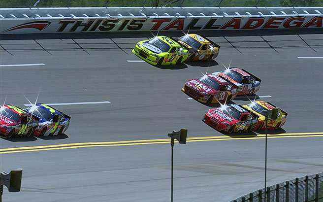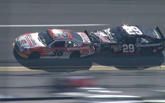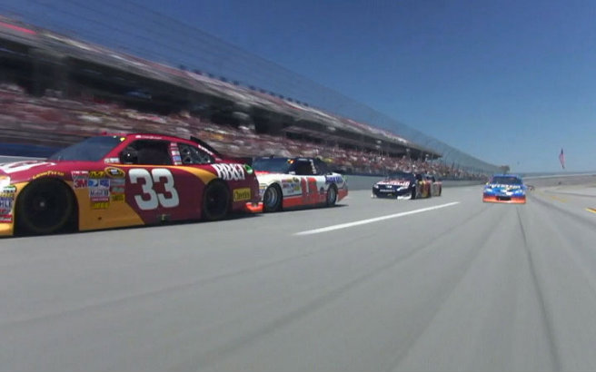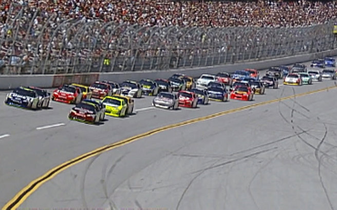 Turn 3 Bowyer und Harvick außen neben Gordon und Martin. Dahinter Johnson und Eranhardt Jr.. So ging es auch raus aus Turn 3. Immernoch diese beiden Päarchen vorne nebeneinander. Gordon und Martin ein Milimeter weiter vorne. Ein paar Meter vor der Ziellinie stachen unten Johnson und Eranhardt Jr.durch. Martin wollte noch blocken, es war aber zu spät den Johnson war schon neben ihm. Oben kamen noch neben Bowyer und harvick auf einmal Edwards und Biffle mit ins Spiel. 4-Wide. Gordon versuchte noch Johnson zu blocken doch er schaffte es auch nicht da Johnson sehr schnell unterwegs war und auch schon neben ihm. So ging es dann über die Zielliene. Es war kaum auszumachen wer jetzt gewonnen hatte. Johnson oder Bowyer. Gordon war eine halbe Motorhaube hinter den beiden in der Mitte drüber gegangen.