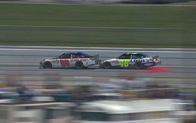 Jetzte weitere Führungswechsel der ersten beiden Päarchen. Und ein weiterer in dem aber Bowyer und Harvick unten die Tür offen gelassen haben und dort sehr schnell Jeff Gordon und Mark Martin vorbeischossen und Angriff auf die Führung nahmen. Sie schafften es auch pünklich zur Weißen Flagge als Führende über die Zielliene zu kommen.