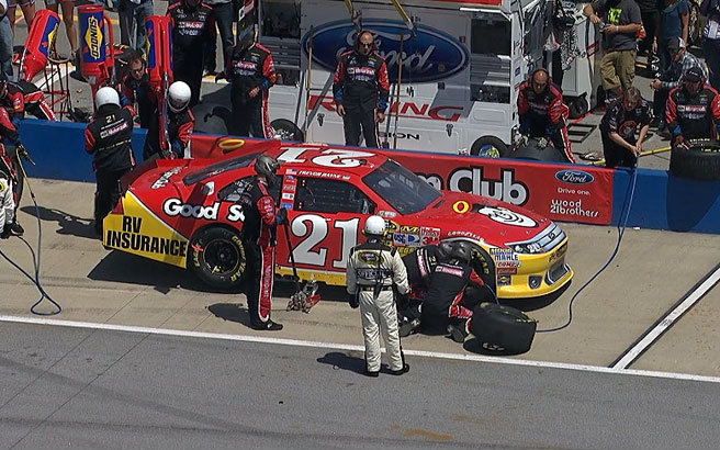 Das Rennen ging dann bis zum Zeil unter Grün weiter. 3 Laps to go hieß es mit #33 Clint Bowyer und #29 Kenvin Harvick an der Spitze, gefolgt von #99 Carl Edwards und #16 Greg Biffle. Vor Ende der dritten Runde überholten Edwards und Biffle, Bowyer und Harvick. Hinter den beiden Päarchen tauchten auch wieder #24 Jeff Gordon und #5 Mark Martin auf. Beide hatten beim letzten Stopp vier Reifen gewechselt gehabt. Zu diesem Zeitpunkt gab es schon über 85 Führungswechsel zu verbuchen. So ging es in die vorletzte Runde.