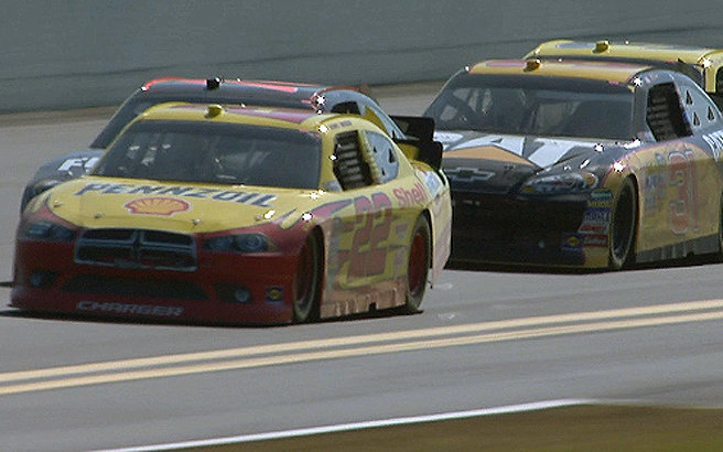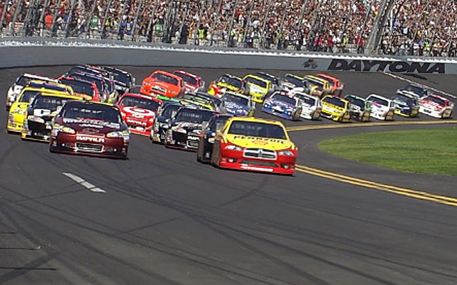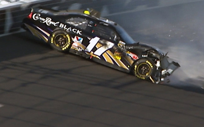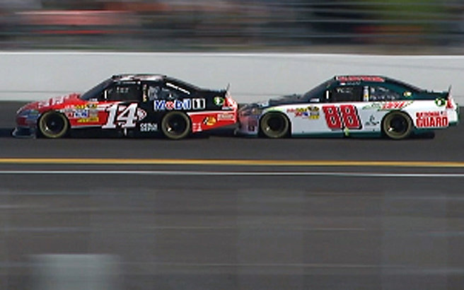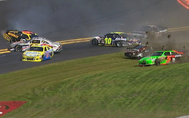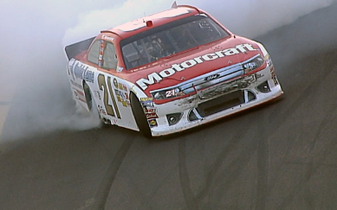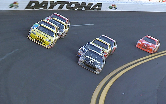 4 Laps vor Ende des Rennens schob ausgerechnet #22 Kurt Busch seinen Flügelman #78 Regan Smith von der Bahn. Smith crashte, konnte aber weiter fahren. Jetzt gab es eine Geen - White - Checkered Situation. Beim Restart konnten sich #6 David Ragan und #21 Trevor Bayne zusammen tun und nach vorne preschen. Verfolgt wurden sie von den Busch Brother, #22 Kurt Busch und #18 Kyle Busch die oben versuchen an den beiden vorbei zu kommen. Auf der Backstrech wurde dann auch Überraschungsmann #7 Robby Gordon hinten angefahren. Er drohte sich zu drehen, konnte jedoch sein Auto Meisterhaft safen. Keine sek. später drehte sich aber dann #39 Ryan Newman in die Außenmauer und löste eine weitere Caution aus. Leider wurde auch beim Ausweichversuch #88 Dale Earnhardt Jr. mit erwischt und knallte auch in die Außenmauer. Zuvor gab es noch die Black Flag für #6 David Ragan. Er hatte beim Restart vor der Finish Line überholt und sich vor #21 Tevor Bayne gesetzt gehabt. Ragan ärgerte sich wahnsinig den es hätte sein aller erste sieg werden können im Sprint Cup.