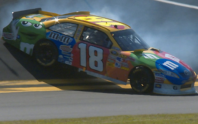 Lap 9 dann der erste Zwischenfall. #18 Kyle Busch drehte sich raus und nam noch #15 Michael Waltrip mit. Sein Auto hatte am Heck ein wenig ab bekommen gehabt, so das es von seiner Crew schnell zu reparieren war, mit ein paar Streifen Klebeband.